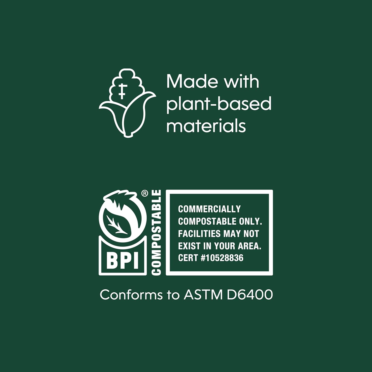 CERTIFIED COMPOSTABLE: Certified by the Biodegradable Products Institute (BPI) under US standard ASTM D6400, for commercial composting
