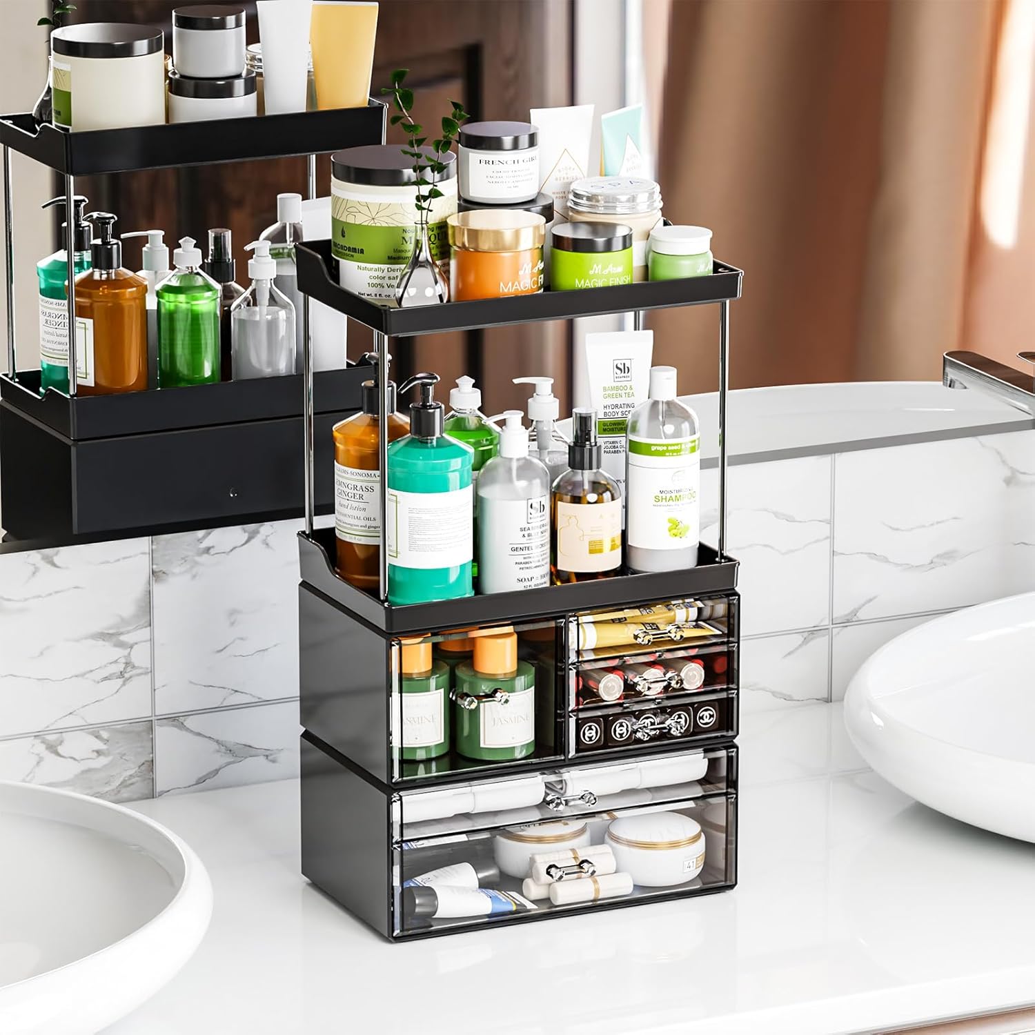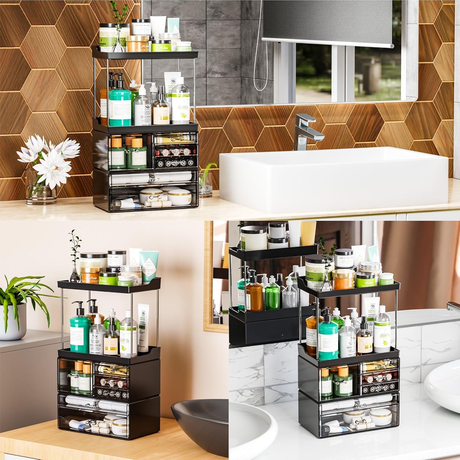 3 Tier 6-Drawer Bathroom Counter Organizer Shelf – Stackable Design – 18.9″ Tall Large Skin Care Organizer Suitable as Makeup,Beauty,Face Product,Lotion,Skincare Organizers,Black
