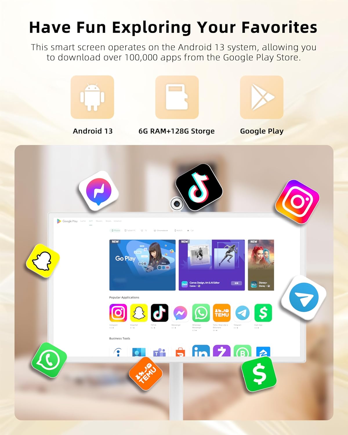 Access to a World of Apps with Android 13: Equipped with Android 13, 6GB RAM, and 128GB storage, this touchscreen TV monitor allows seamless access to a wide range of apps from the google play store. Customize your device and enjoy all your favorite apps with ease, whether for entertainment, productivity, or leisure.