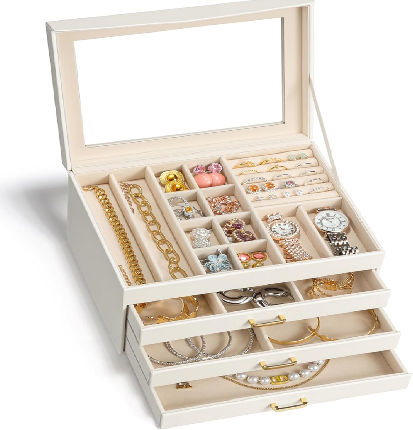 4Layer Jewelry Box with Glass Lid, Large Jewelry Organizer with 3 Drawers for Women Girls, Adjustable Compartments, Modern Style, Cream White