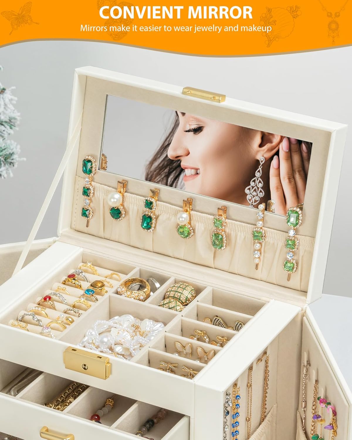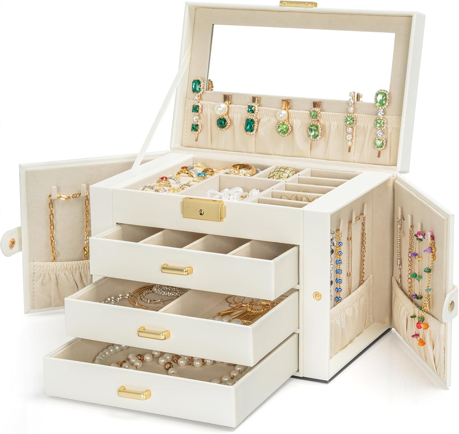 AKOZLIN Large 4-Tier Jewelry Box Leather Jewelry Storage Organizer with 3 Drawers Lockable for Women Girls Ring Necklace Earring Bracelet Watches Holder with Mirror White