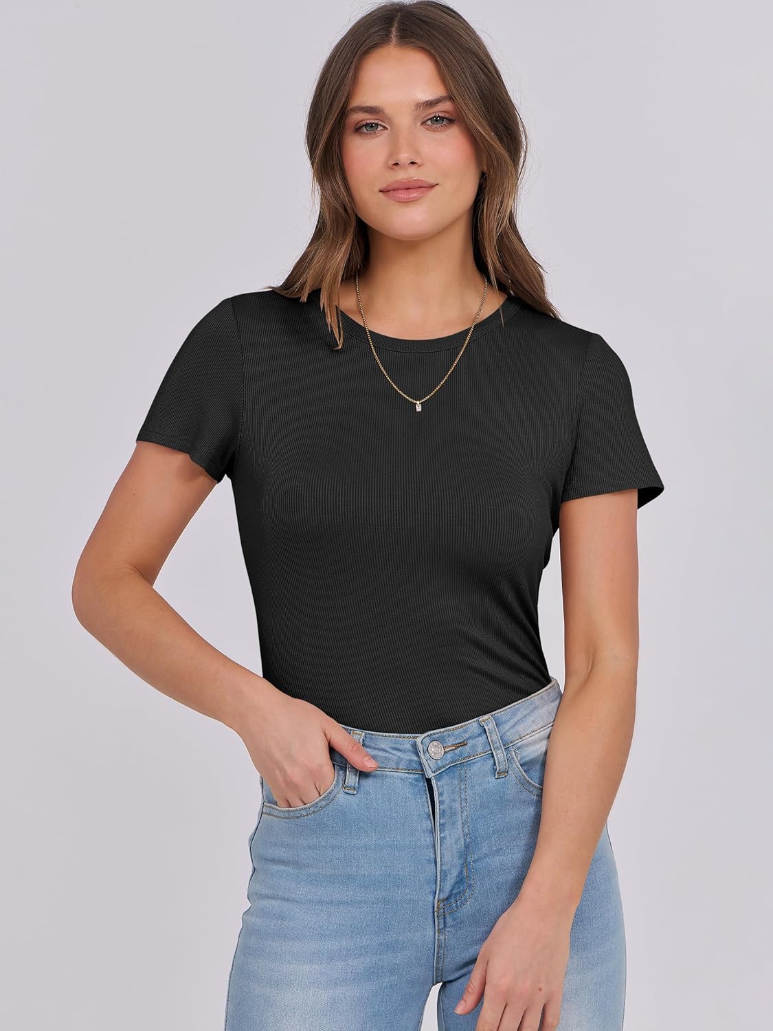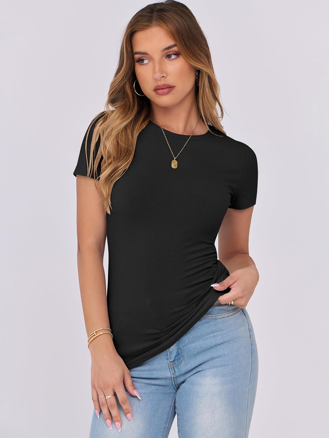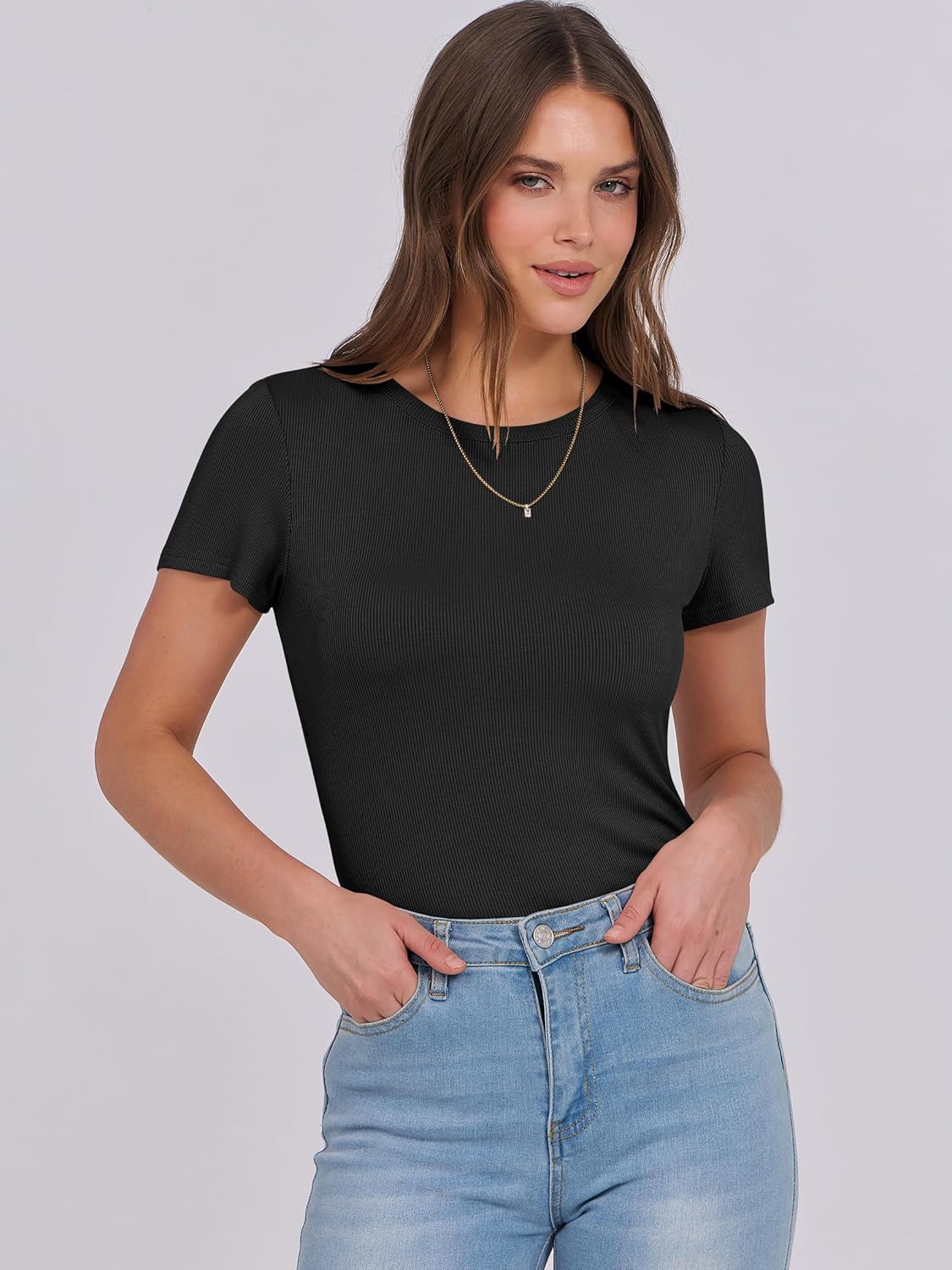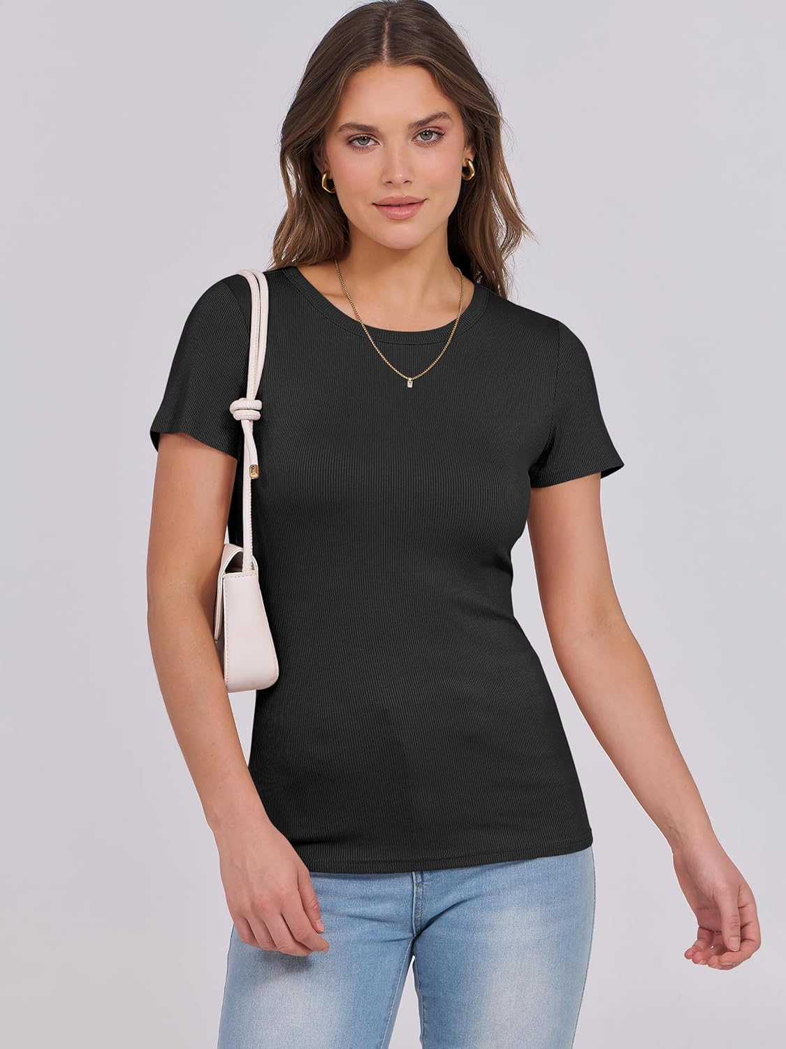ANRABESS Women Short Sleeve Crewneck Ribbed Knit Slim Fitted Shirts Summer Tops Basic Tee T-Shirt Undershirt 2025 Clothes