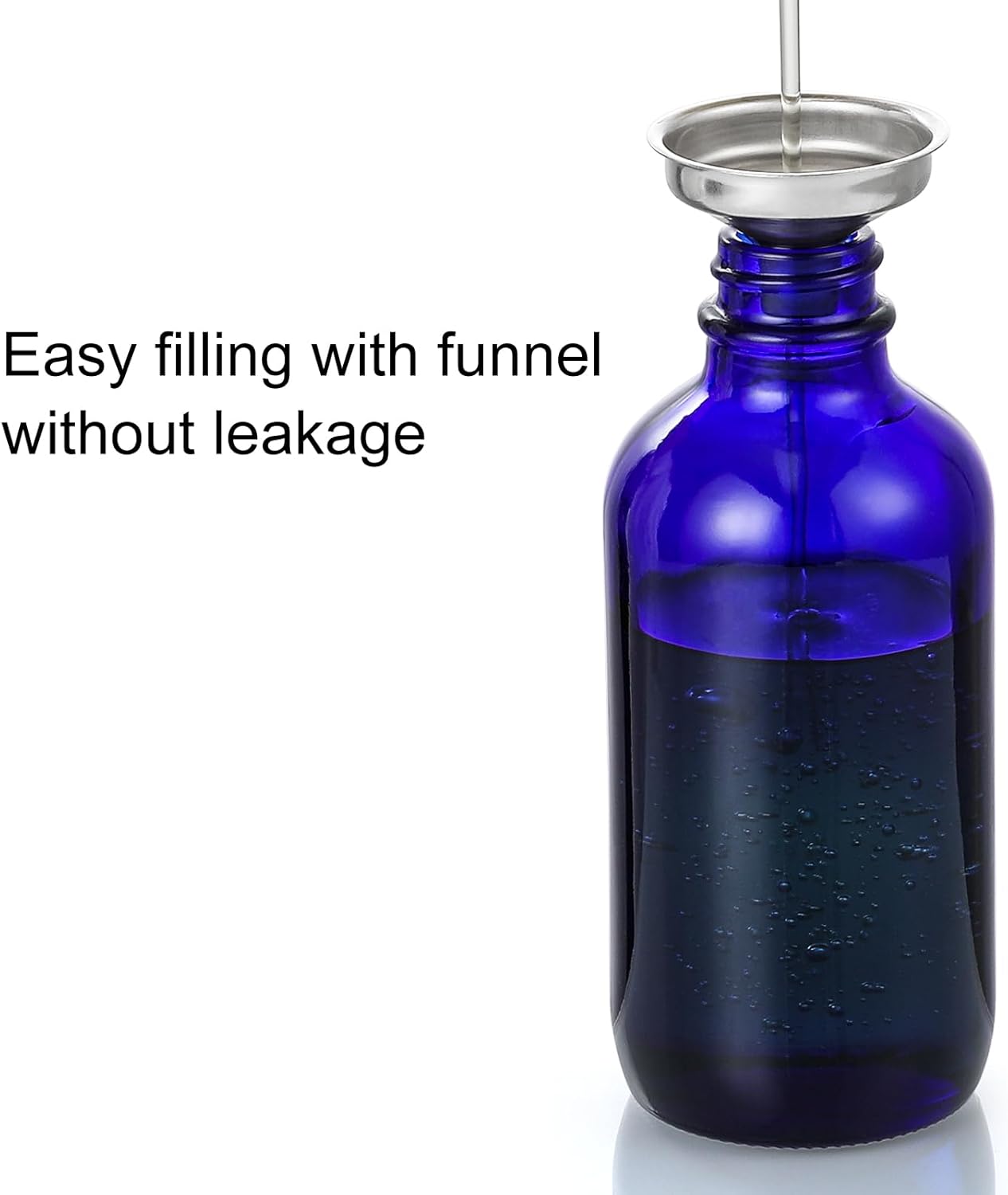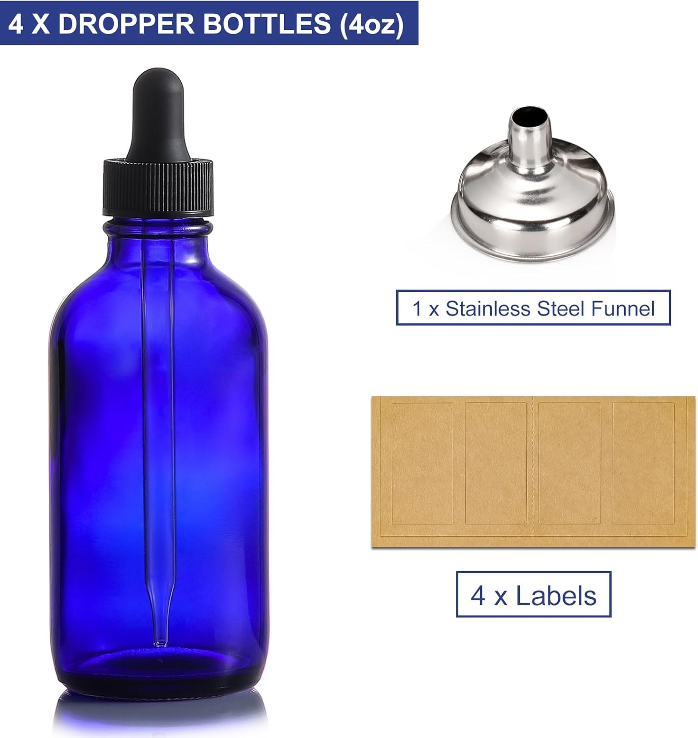 Product Includes – 4 pcs dark blue dropper bottles + 1 small stainless steel funnel + 4 kraft paper color labels