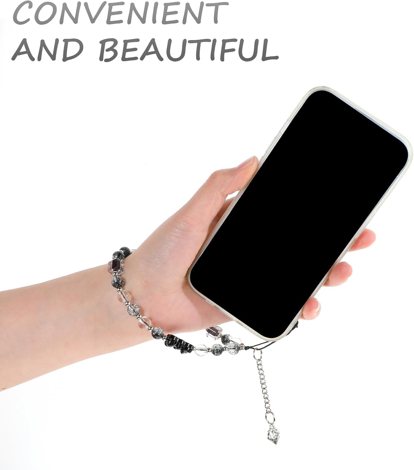 Black Phone Charms Strap Crystal Beaded Wrist Phone Strap Lanyard Cute Aesthetic Cell Phone Keychain Bracelet Strap Stationery Decoration Charm for Key Camera Purse Women Phone Case