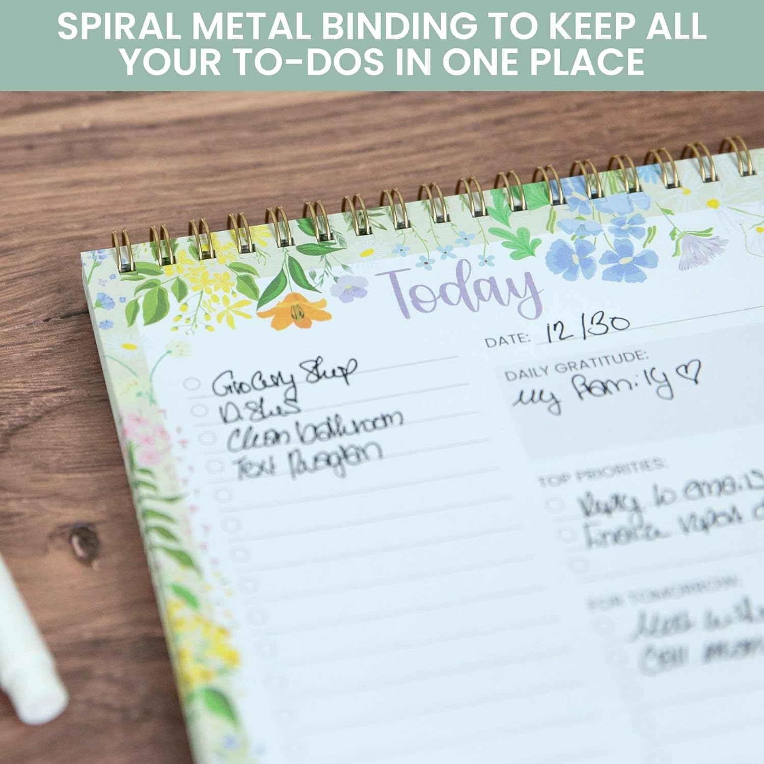Take control of your day with our Page-a-Day Daily To-Do List Notebook, designed to make staying organized and productive effortless. This 6″ x 9″ planner/notebook hybrid features 60 sheets of smooth, high-quality paper that help you keep track of tasks, set priorities, and plan ahead with ease. With a stylish gold metal spiral binding and a frosted protective cover, it’s perfect for carrying in your bag or purse without worrying about wear and tear. Each page includes spaces for the date, top priorities, tomorrow’s tasks, and plenty of room for your general to-do list items. Plus, the delicate floral edge design adds a little beauty to your daily routine.
