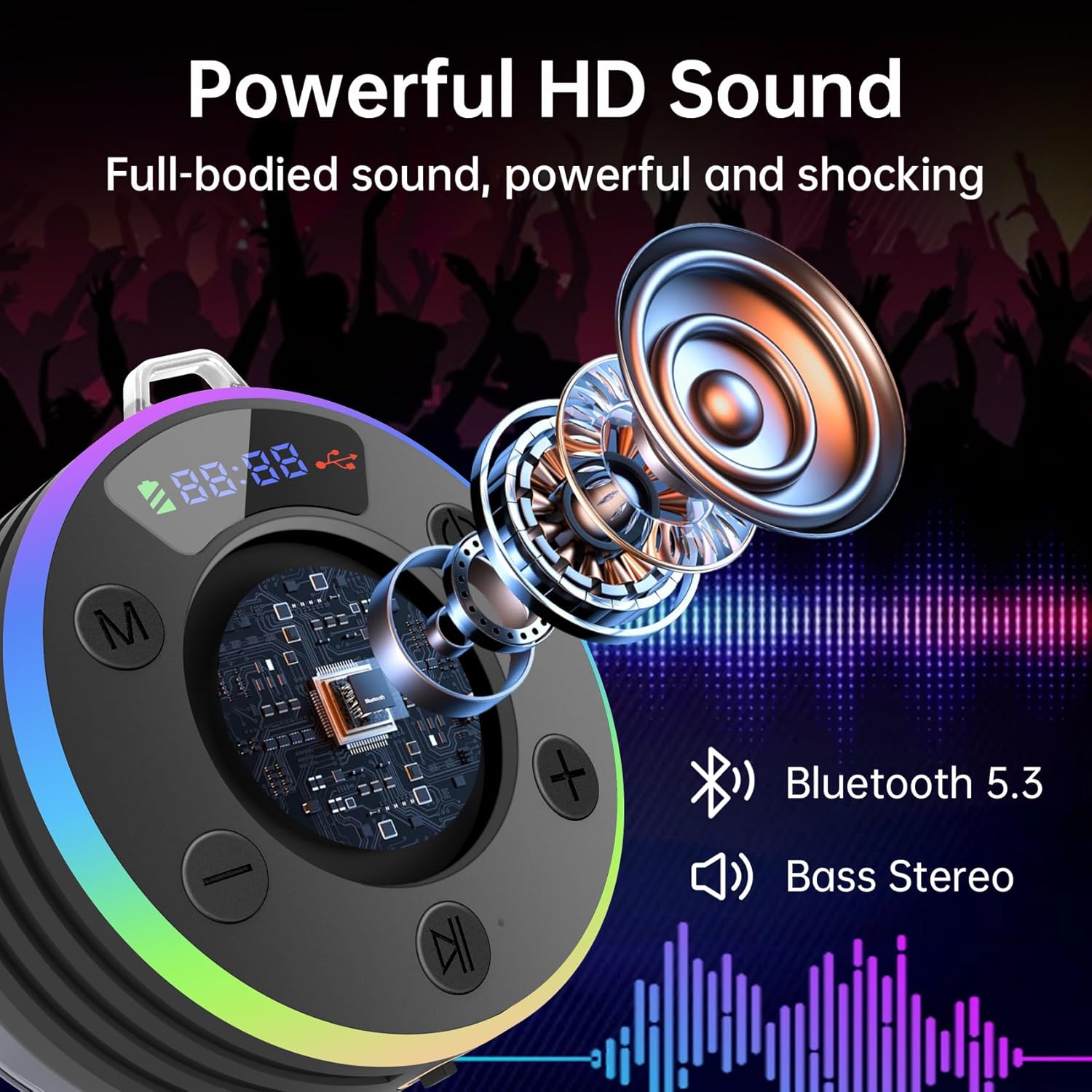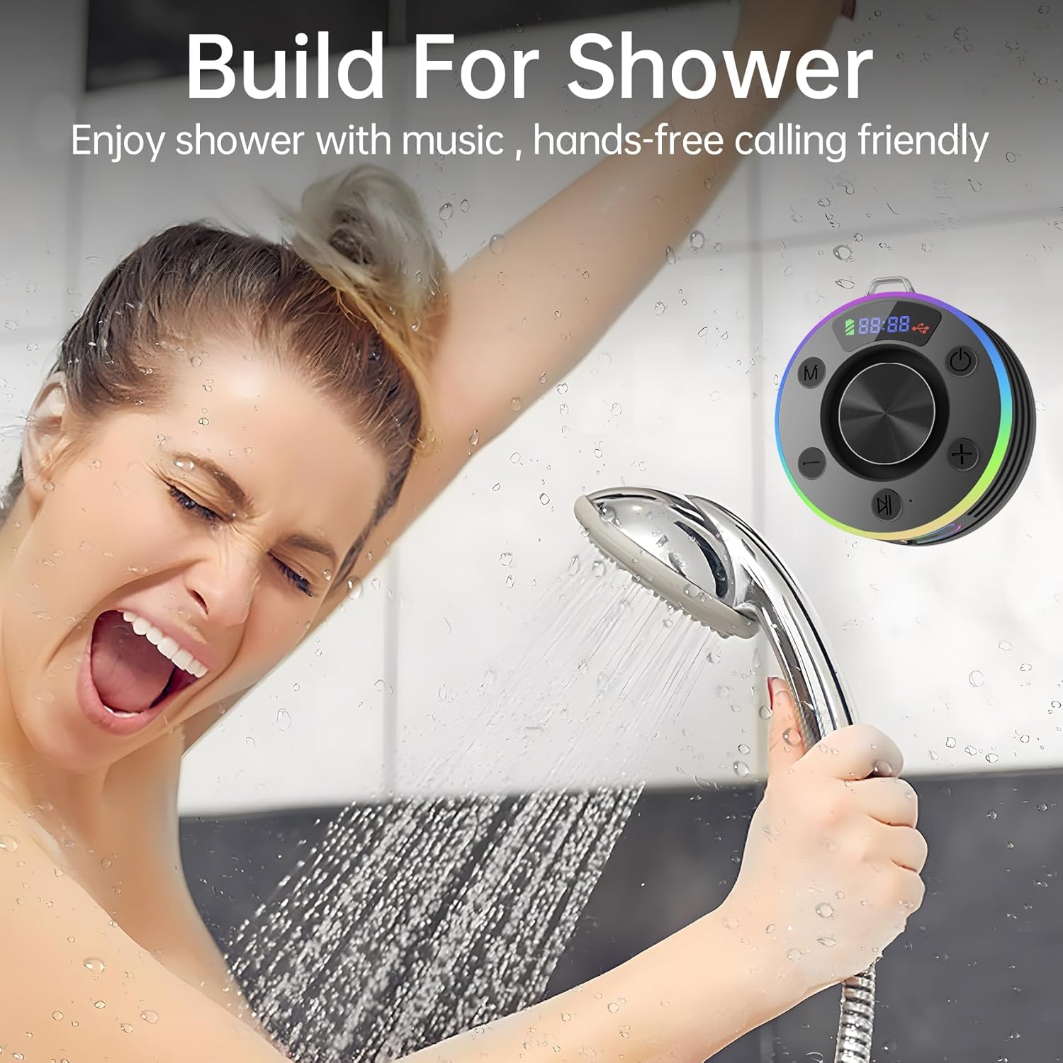 Bluetooth Shower Speaker,Portable Shower Speaker HD Sound,Wireless Bluetooth 5.3 w/Time Display,IP7 Waterproof Speaker w/RGB Light,Suction Cup/Lanyard,Handsfree for Bathroom Pool Beach Party