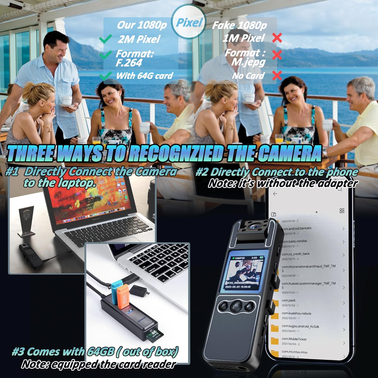 【6 HR Battery life/64GB & 3 ways to Replay】The Body Camera with Equipped with a 1600mAh rechargeable battery, that can last almost 6-7 HR working time, also supports 24/7 recording video when connecting the power bank/power, helps you keep an eye on everywhere. ①Our body cameras have a built-in 64GB card, to support your long-time recording saving and are recognized by cellphones/laptops/PC to replay.②Replay on screen.