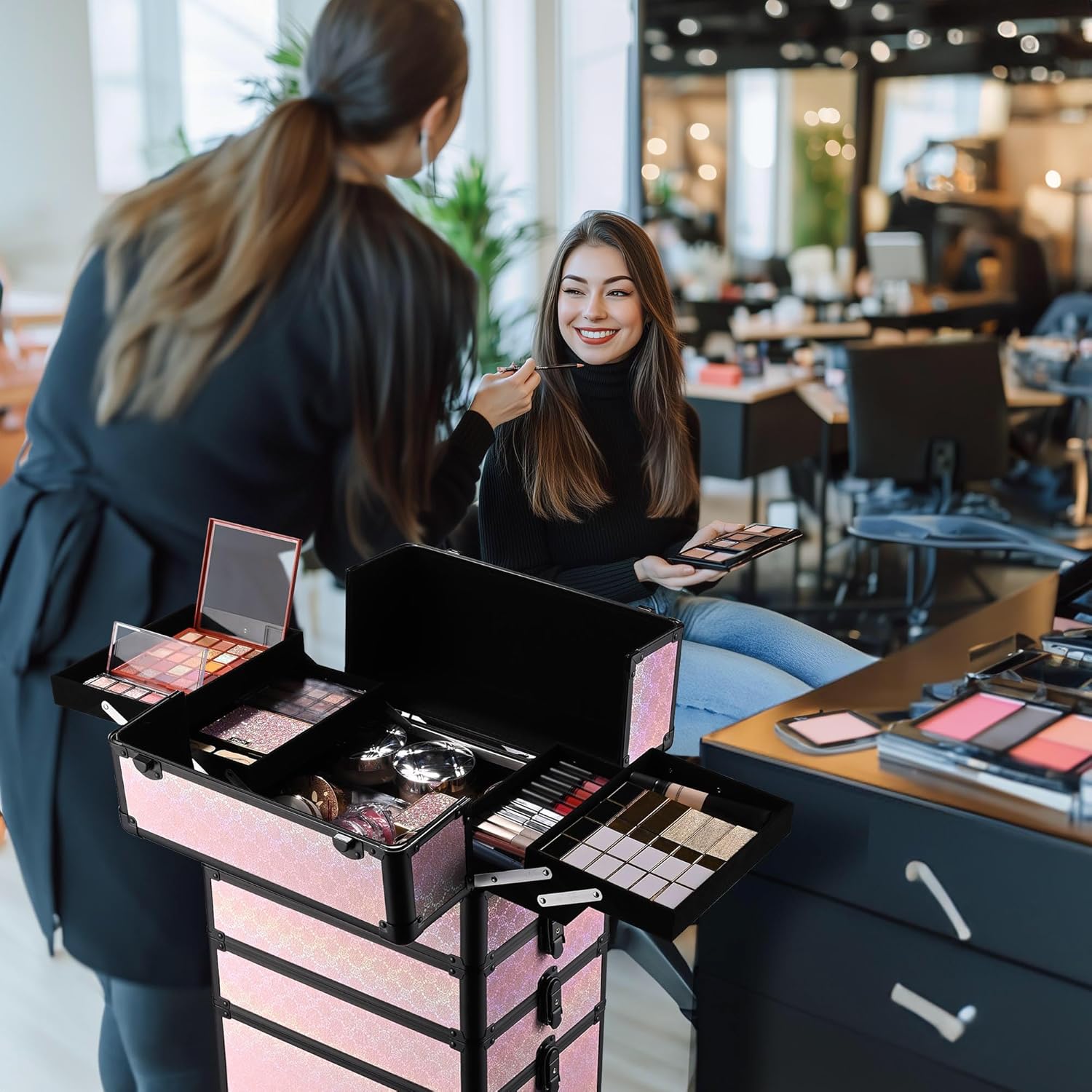 BYOOTIQUE Rolling Makeup Train Case 4in1 Cosmetic Trolley Organizer Lockable Salon Barber Cart Trunk with Wheels for Hairstylist Artist Trave Nail,Blush ForgetMeNot