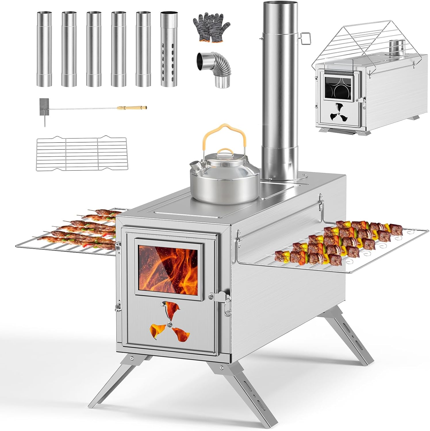 Portable Wood Stove with Flip-up Shelves: All accessories (7 Chimney Pipes, Ash Scraper, Fireplace Grate) can be stored inside the tent stove. Our foldable legs allow for easy storage, saving space, while the side shelves convert into handles for convenient transportation. Ideal for outdoor activities like camping, fishing and hunting.