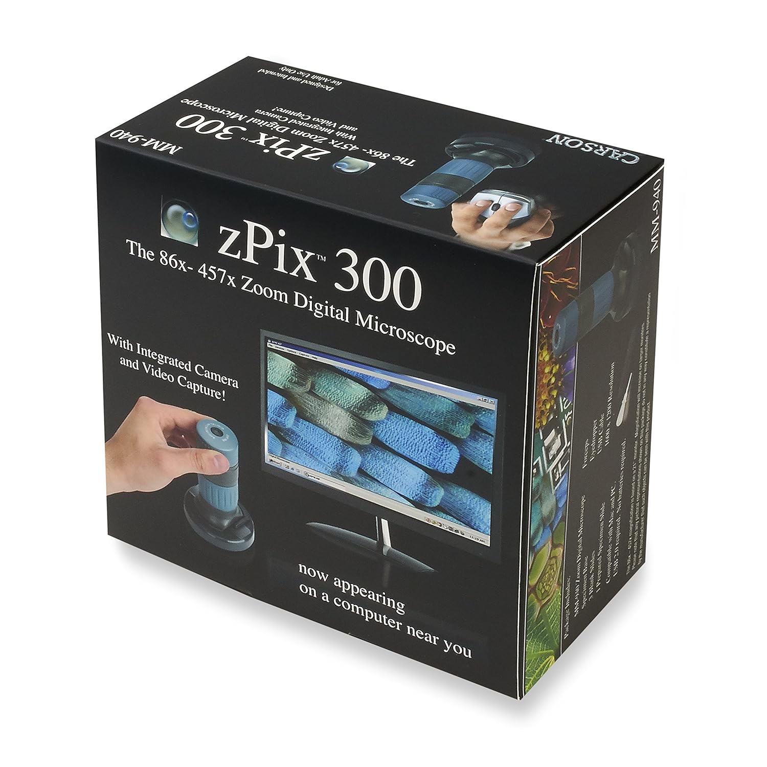 The zPix (MM-640) from Carson is a powerful USB zoom digital microscope that displays the magnified image right on your computer screen. The impressive 35x-165x effective magnification (based on a 21” monitor) allows you to see details of ordinary objects you never knew existed! Capture an image to keep using the built-in 640 x 480 resolution Digital Camera. You can even capture close-focus video! The MM-640 zoom digital microscope is compatible with the following: All MAC operating systems, Windows 7 (32 bit or 64 bit), Windows 8/8.1, Windows 10 or earlier Windows versions such as Windows XP SP2 and Windows Vista (32 bit or 64 bit). USB 2.0 or 3.0 port is required. No batteries required. Please visit the Carson website to download any software updates for the zPix digital microscope. Please note, the effective magnification is a combination of the optical system and a high powered digital zoom. The zPix 300 (MM-940) from Carson is a powerful zoom USB digital microscope that displays a magnified image right on your computer screen. The impressive 86x-457x effective magnification (based on a 21″ monitor) allows you to see details of ordinary objects that you never knew existed! Capture an image to keep with the click of a button. You can even capture close focus video and send it to your friends and family. Use the base attachment to view prepared slides or remove the base and place the microscope on any surface to reveal fine details. The zPix 300 USB digital microscope will provide hours of fascinating and educational entertainment for adults and children alike. The zPix 300 is compatible with both Mac and PC platforms. A USB 2.0 or 3.0 port is required. The zPix 300 also comes included with a specimen base, 3 blank slides, 1 prepared specimen slide, forceps, eyedropper and a USB Cable. Please note, the effective magnification is a combination of the optical system and a high powered digital zoom. Both the zPix and zPix 300 are backed by Carson’s one year limited warranty. At Carson, we strive to make sure our customers are 100% satisfied with the quality of our products. We are so confident in our products that we back them with a One Year Limited Warranty! This Carson product is warranted to be free from defects in material and workmanship for a period of one year from date of purchase. Please contact Carson for additional warranty details.