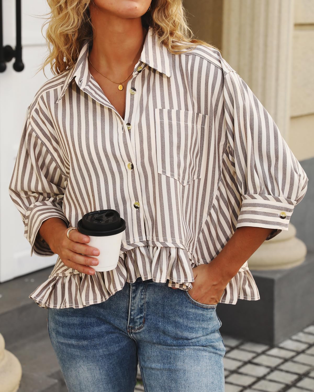 Romantic Details: Delicate puff sleeves and a ruffled hem add feminine flair, while the button-down front keeps it polished and versatile. Cool & Comfortable: Crafted from a lightweight, breathable fabric blend (similar to premium twill), this blouse wicks moisture and keeps you fresh even on the hottest days. Easy Summer Styling: Whether you’re dressing up for brunch, a casual workday, or a weekend getaway, this blouse pairs beautifully with jeans, skirts, or shorts for an effortlessly chic outfit. Stay stylish, comfortable, and confident all season long with this must-have summer top! Stripes: Vertical stripes create a flattering, elongating effect, making this top as figure-friendly as it is fashionable. Perfect For:Sunny days, vacations, date nights, or casual.