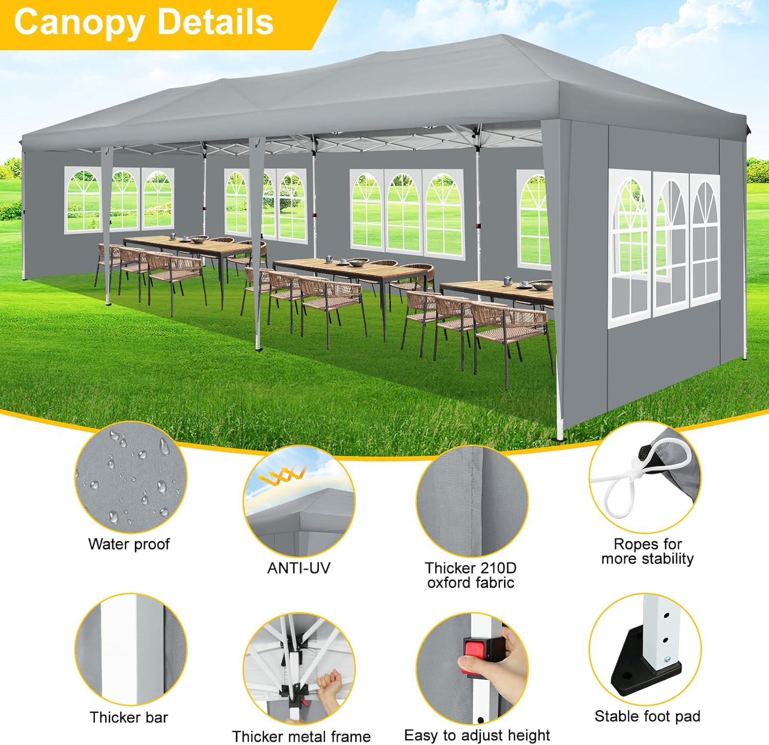 [Excellent Material]: 10x30ft popup canopy is made of 210D silver-coated waterproof Oxford cloth, and even the waterproof pressure can reach 1000pa, which can effectively resist ultraviolet rays.