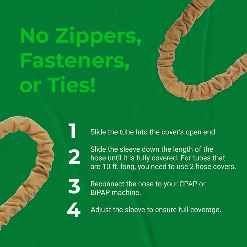 Perfect Fit for Most Tubes: Our CPAP tube insulating cover measures 9 ft. long, making it suitable for 6 ft. and 8 ft. long tubes and stays in place without zippers, ties, or fasteners. For 10 ft. long hoses, you will need two CPAP hose covers for full coverage.