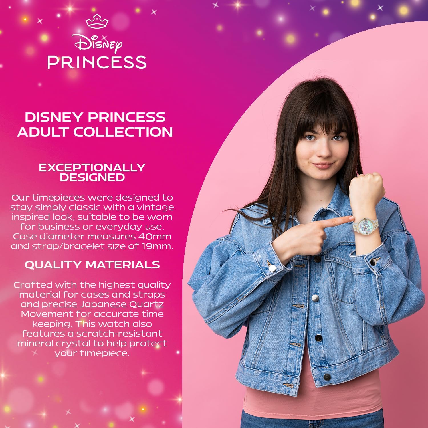 Disney Princess Ariel Women’s Two Tone Alloy Glitz Bezel Watch, Two Tone Alloy CZ Glitz Link Bracelet, Case diameter measures 40mm and bracelet size of 20mm. Dial Features Ariel. Mineral glass crystal, stainless steel case back, Japan quartz movement, water resistance to 100 feet.