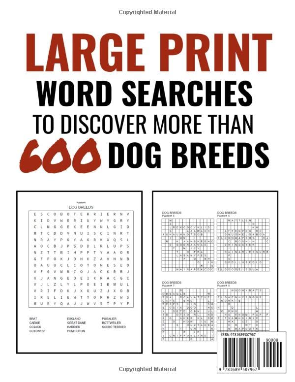 40 word searches puzzles about DogsMore than 600 dog breeds & crossbreeds to discoverLarge print words for easy readingPrinted solutions at the end of the bookEasy-to-Carry dimensions: 8.5″x11″, 50 pages