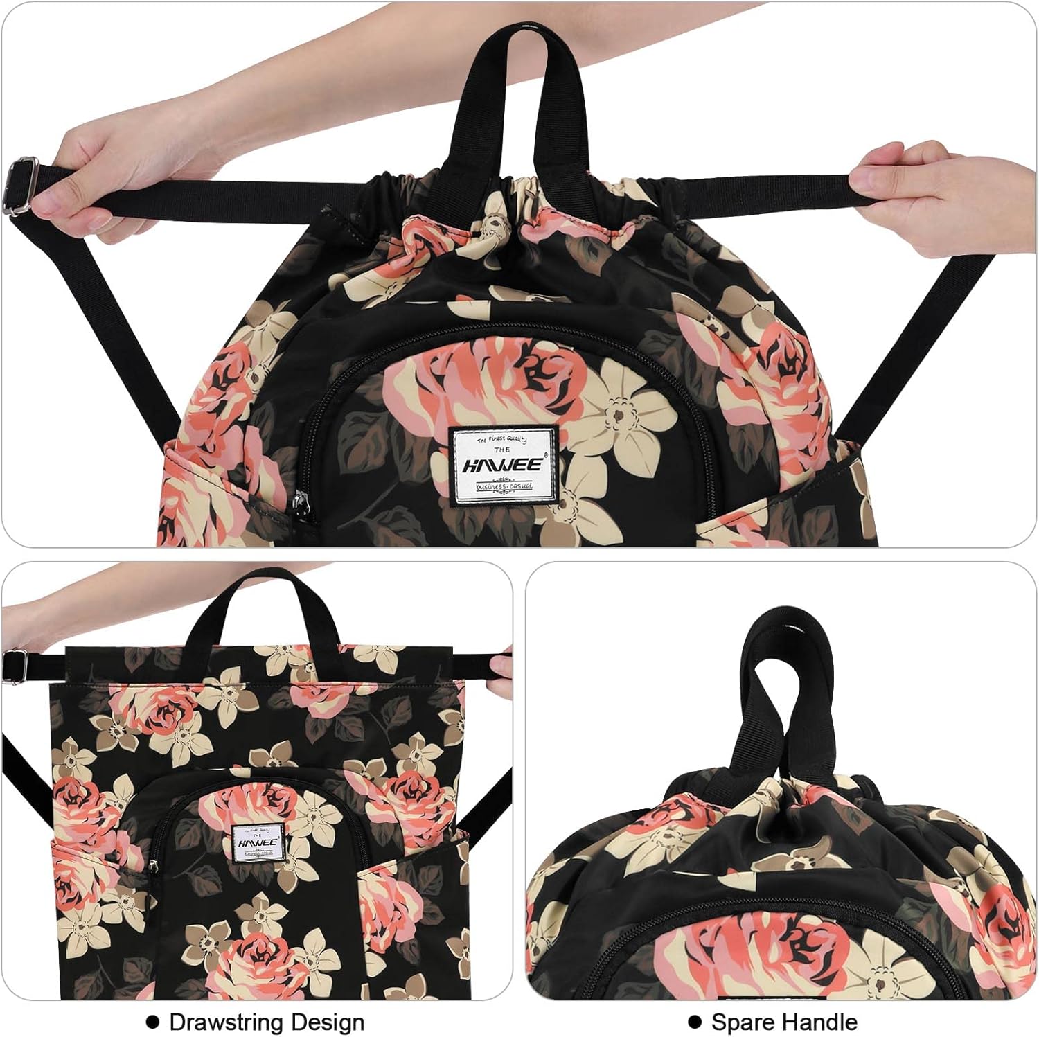 The drawstring closure is convenient to open and close, easy to grab in a hurry, we added spared handle so you can keep it hang on and away from the dirty floor when not in use.