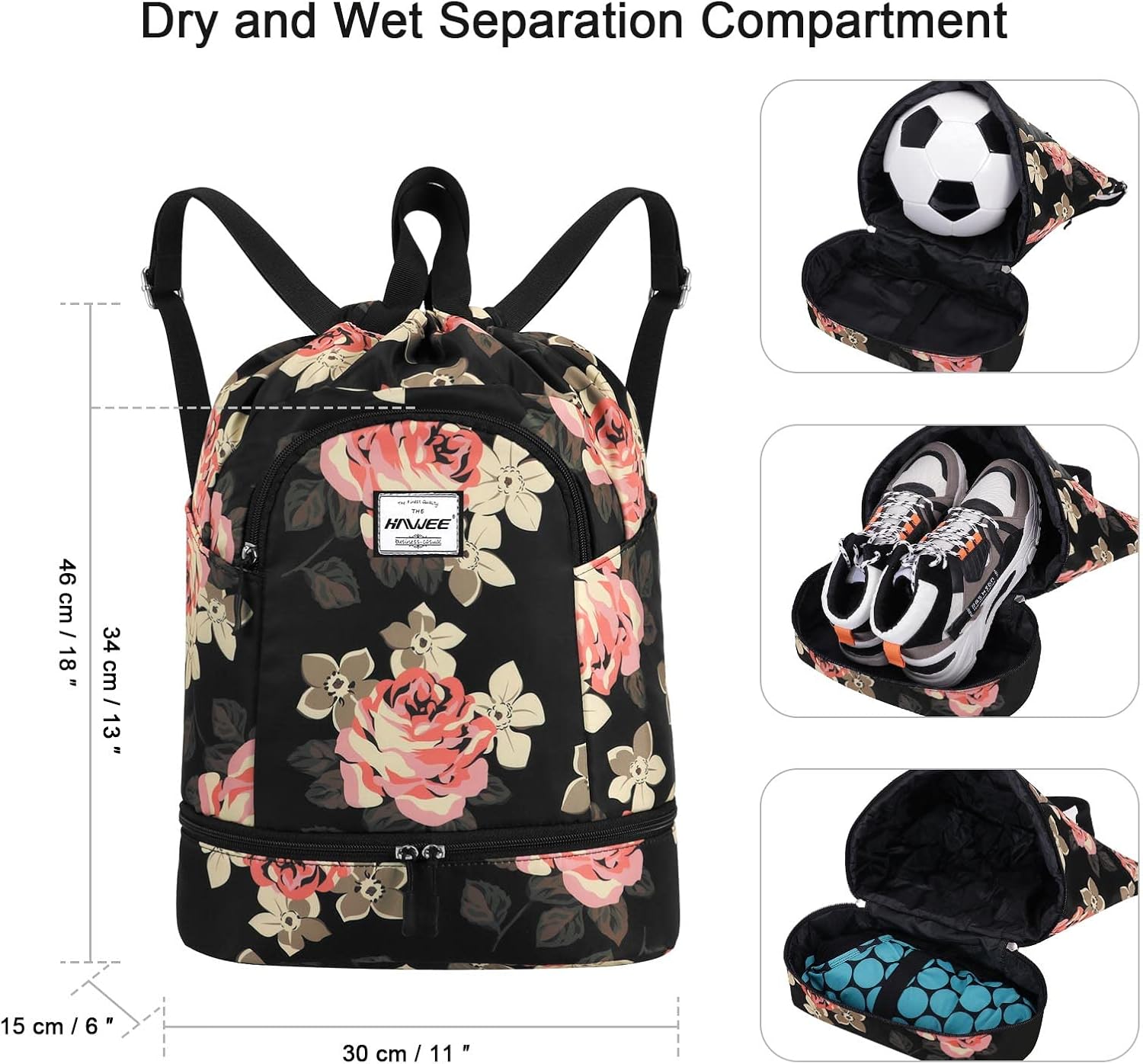 This drawstring backpack features dry wet compartment where you can put wet clothes and towels separately after you doing gym or sports.
