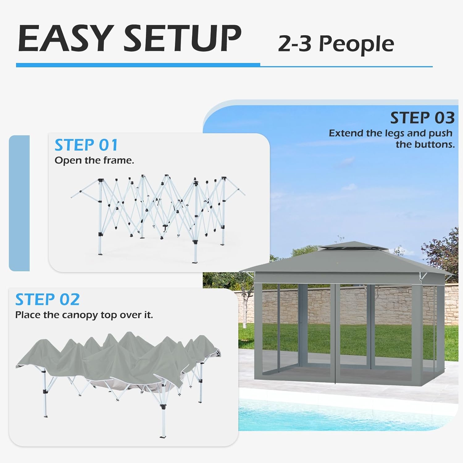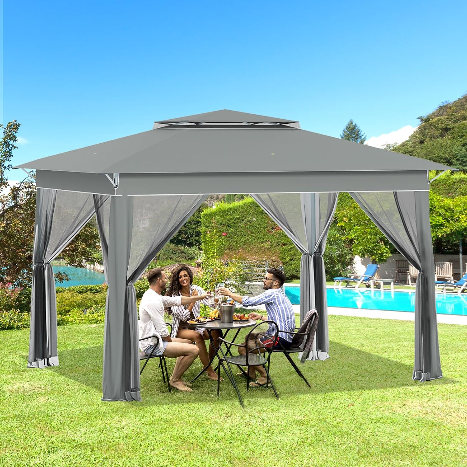 【Double-Roof】The ventilated double-roof design enhances air circulation and wind resistance, keeping the cool even on hot days while the built-in mesh netting between the tops keeps mosquitoes and flying insects at bay. Ideal for all-season use and versatile patio or garden setups