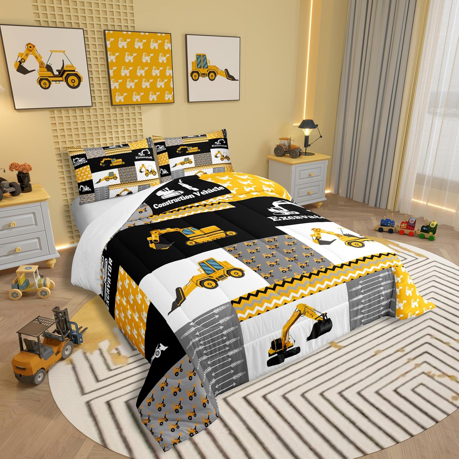 Feelyou Excavator Comforter Construction Vehicles Comforter Set Equipment Trucks Bedding Set for Children Kids Boys Girls Cartoon Car Duvet Set Geometric Lattice Room Decor Quilt Set Toddler Size