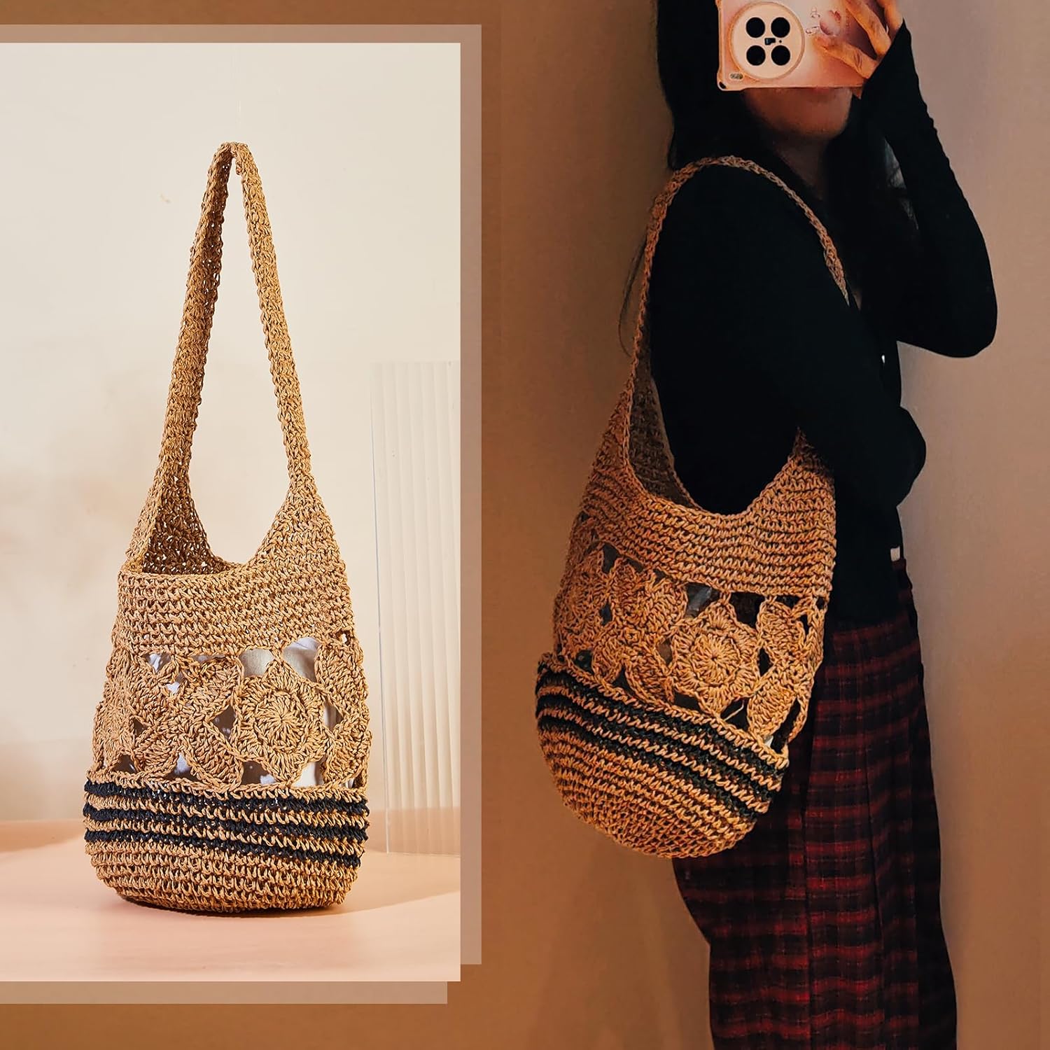 Woven raffia shoulder bags, with hollow flower pattern design in the middle.