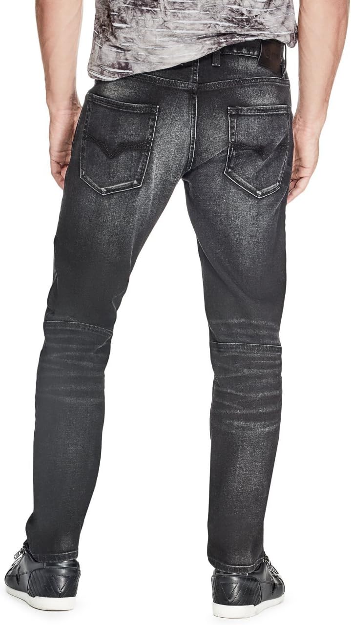 Slim-fit jeans designed with tapered leg plus moto and destroyed details. Zip fly.