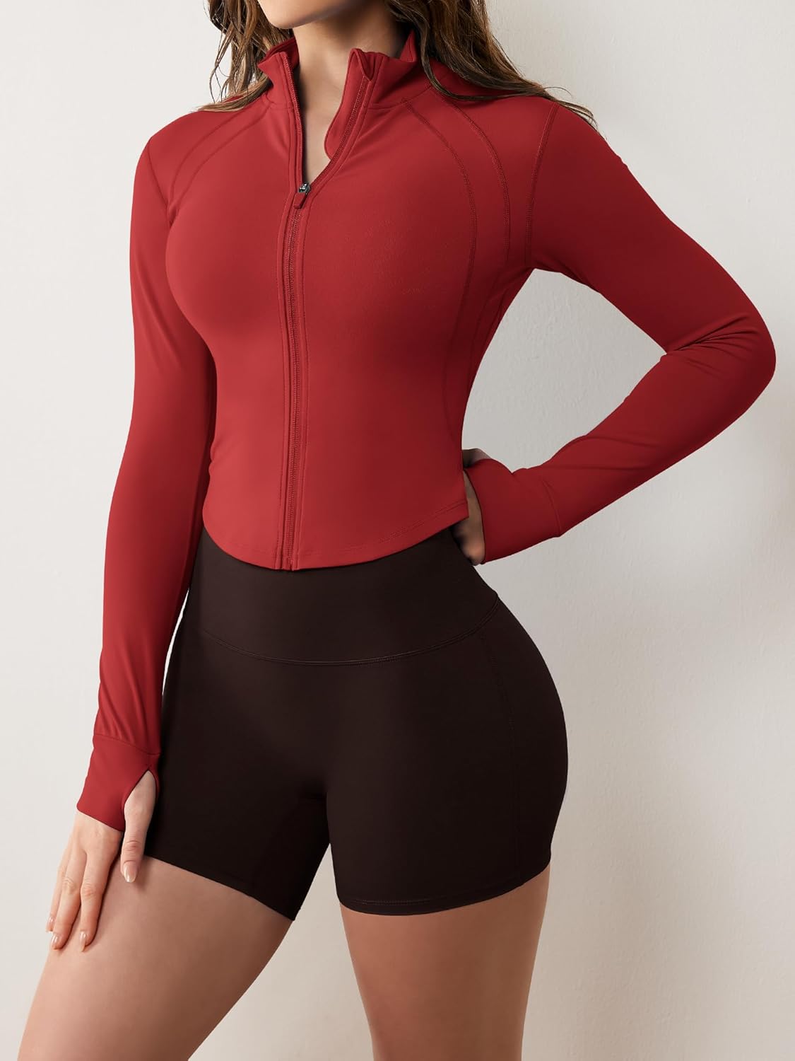 Customers find the workout jacket fits perfectly and appreciate its high-end quality for the price. The jacket is soft and hugs the body in all the right places, while being stretchy for comfort. They find it flattering, with one customer noting it contours the body nicely.
