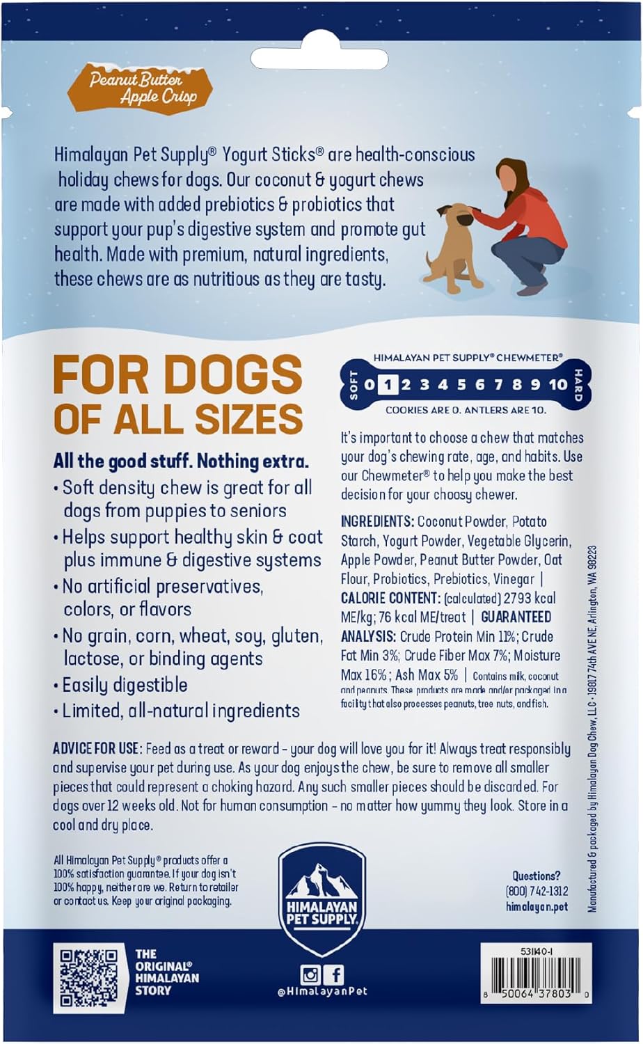 Give your dog the perfect blend of taste and health with Himalayan Dog Chew Yogurt Sticks PB Apple Crisp. These premium dog chew sticks are crafted with your pet’s well-being in mind, combining natural ingredients and delicious flavor for a treat that’s as nutritious as it is enjoyable. Made from yogurt and coconut, these chewing sticks are gentle on digestion, making them ideal for dogs of all ages, sizes, and sensitivities. With no artificial flavors, preservatives, lactose or grains, they’re a wholesome choice for those who prioritize clean, natural nutrition. These soft chew sticks offer a gentle texture that is ideal for dogs of all ages, from playful puppies to senior companions, providing a delicious treat that’s easy to enjoy and full of flavor. Packed with dog probiotics for digestive health, these treats also provide vital support for a balanced gut and a shiny coat, giving your furry friend a boost from the inside out. Inspired by centuries-old Himalayan traditions, these natural chews for dogs are crafted with care to ensure they meet the highest standards of quality. Himalayan’s unique process removes lactose while preserving essential nutrients, creating an easily digestible snack your dog will love. Whether your pup is a playful puppy or a wise senior, these yogurt sticks for dogs are soft enough for gentle chewers yet durable enough for to satisfy their chewing instincts. Perfect for daily rewards or special occasions, the the PB Apple Crisp flavor adds a festive twist to your dog’s treat routine. Whether you’re focused on grain free options or seeking gluten free dog food, these treats cater to your pet’s dietary needs while supporting their overall health. Experience the joy of providing your pup with a treat that’s not only tasty but also promotes a healthy lifestyle. Bring home Himalayan Dog Chew Yogurt Sticks Pumpkin Pie today and let your dog enjoy a flavorful, beneficial treat backed by Himalayan’s expertise and commitment to innovation. From digestive health to oral care, these treats are a testament to your love and care for your furry companion.