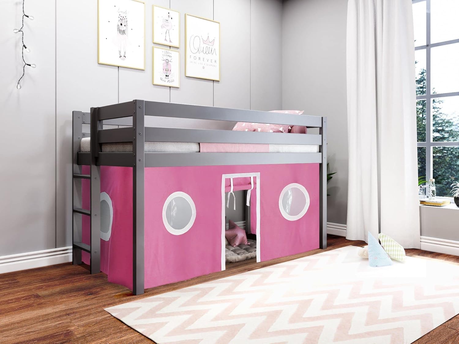 JACKPOT! Contemporary Low Loft Twin Bed with a Ladder in a Gray painted wood | Pink and White Tent for Fun – One (1) Front Curtain and One (1) Side Curtain | Recommended for children 6 years and older. No need for a bunkie board or a bunkie mattress as this bed comes with a complete set of slats | Made with solid wood including knot free New Zealand pine. Ladder can be placed on the right or the left side of the bed | Assembly required with included tools, SALE IS FOR LOW LOFT BED, LADDER AND TENT ONLY EXCLUDES MATTRESSES | Bed is 49 1/4 high x 80 long x 41 3/4 inches deep. Space under bed is approximately 32 high x 75 wide x 38 1/4 inches deep.