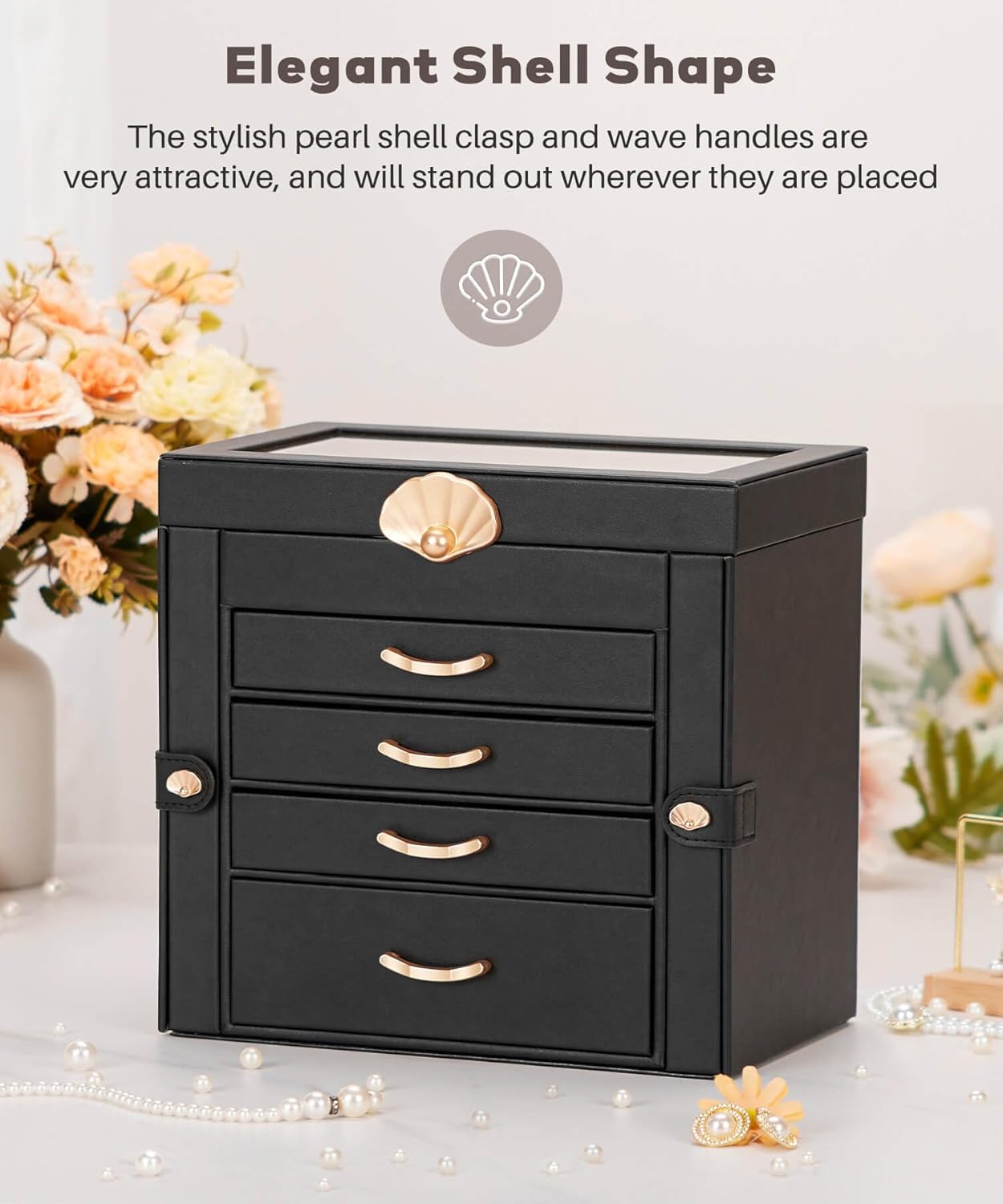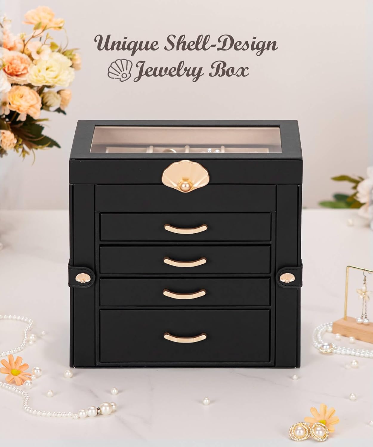 Jewelry Box with 4 Drawers: Display Organizer for Earrings Necklaces – Gift for Girls Women (Black)