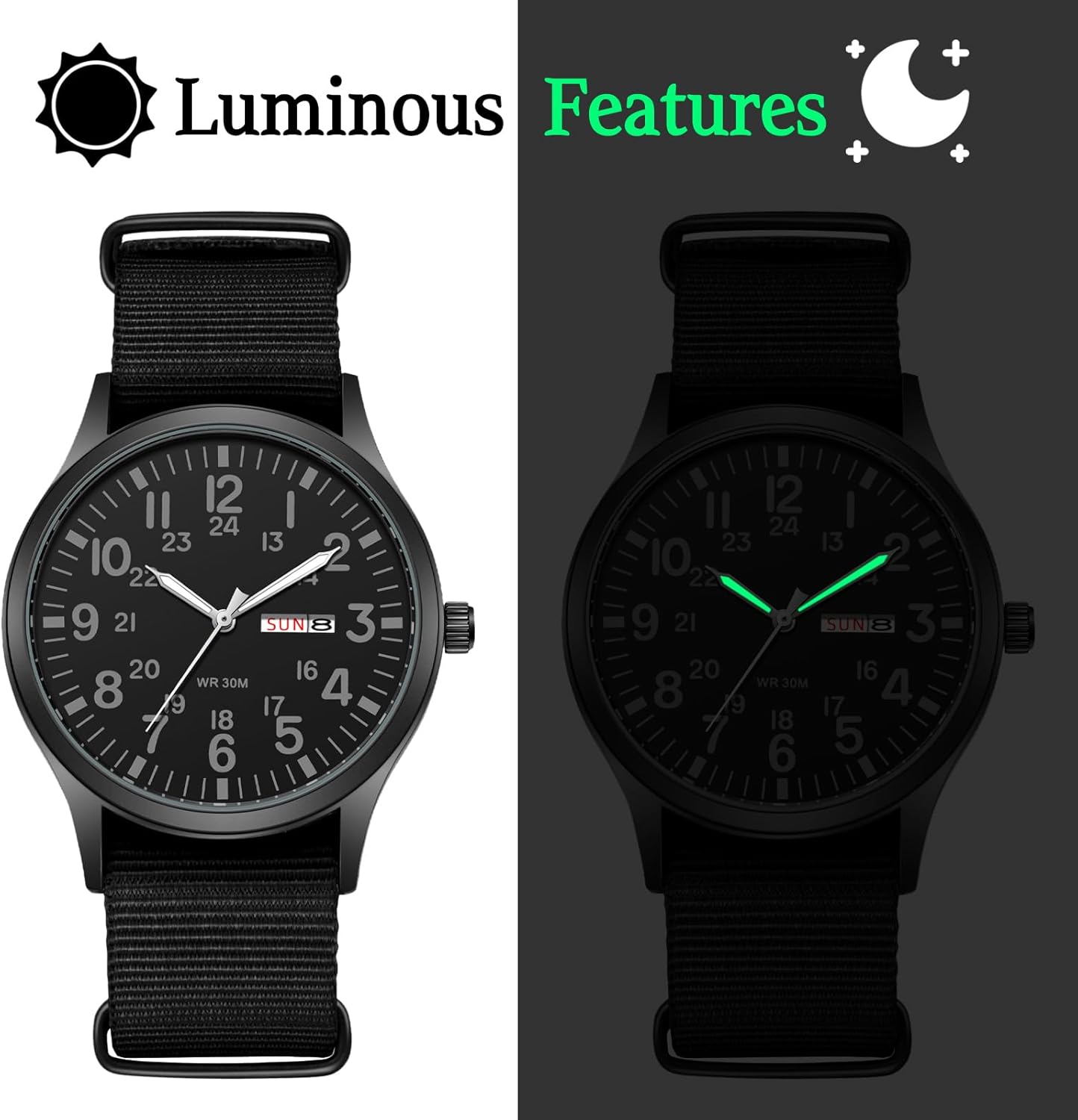 JewelryWe Men’s Tactical Military Watch: Practical Date Day Luminous Arabic Numerals Green Nylon Strap Black Large Dial Outdoor Watch for Men Mountaineering Night Riding Jewelry Gift
