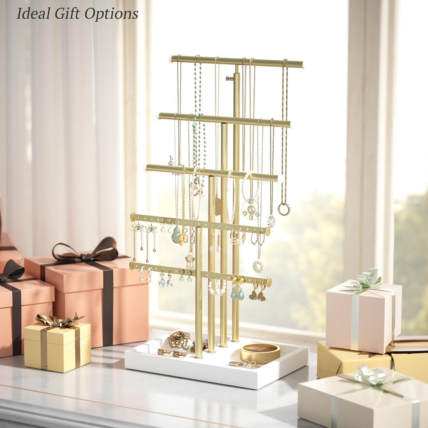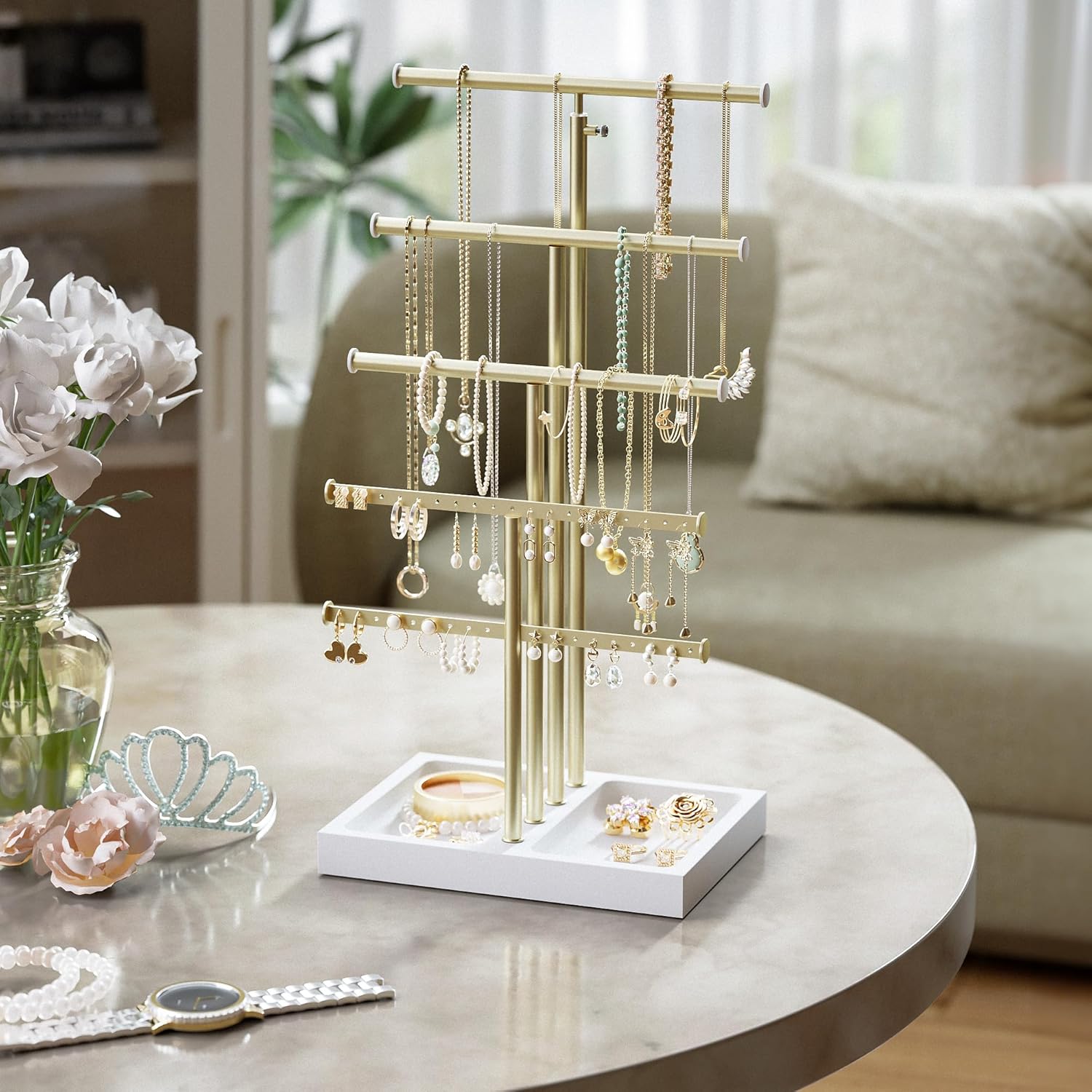 Love-KANKEI Jewelry Organizer Stand,5 Tier Large Necklace Holder with Wood Base,Jewelry holder stand Tree for Display,Bracelets Earrings Rings,Height Adjustable Gift White and Gold