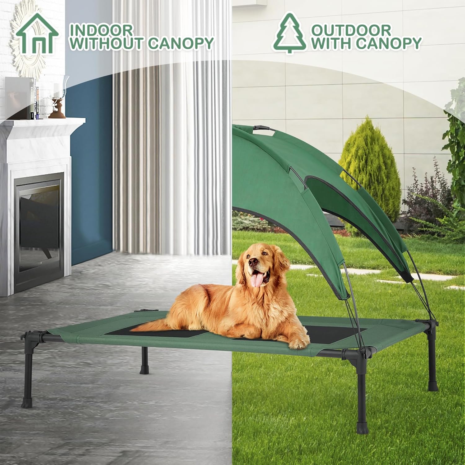 MoNiBloom Medium Elevated Dog Cot with Canopy, 2-in-1 Indoor/Outdoor All-Weather Raised Dog Bed for Medium/Small Dog, Portable Dog Bed Tent Support Up to 60 lbs, Foliage Green