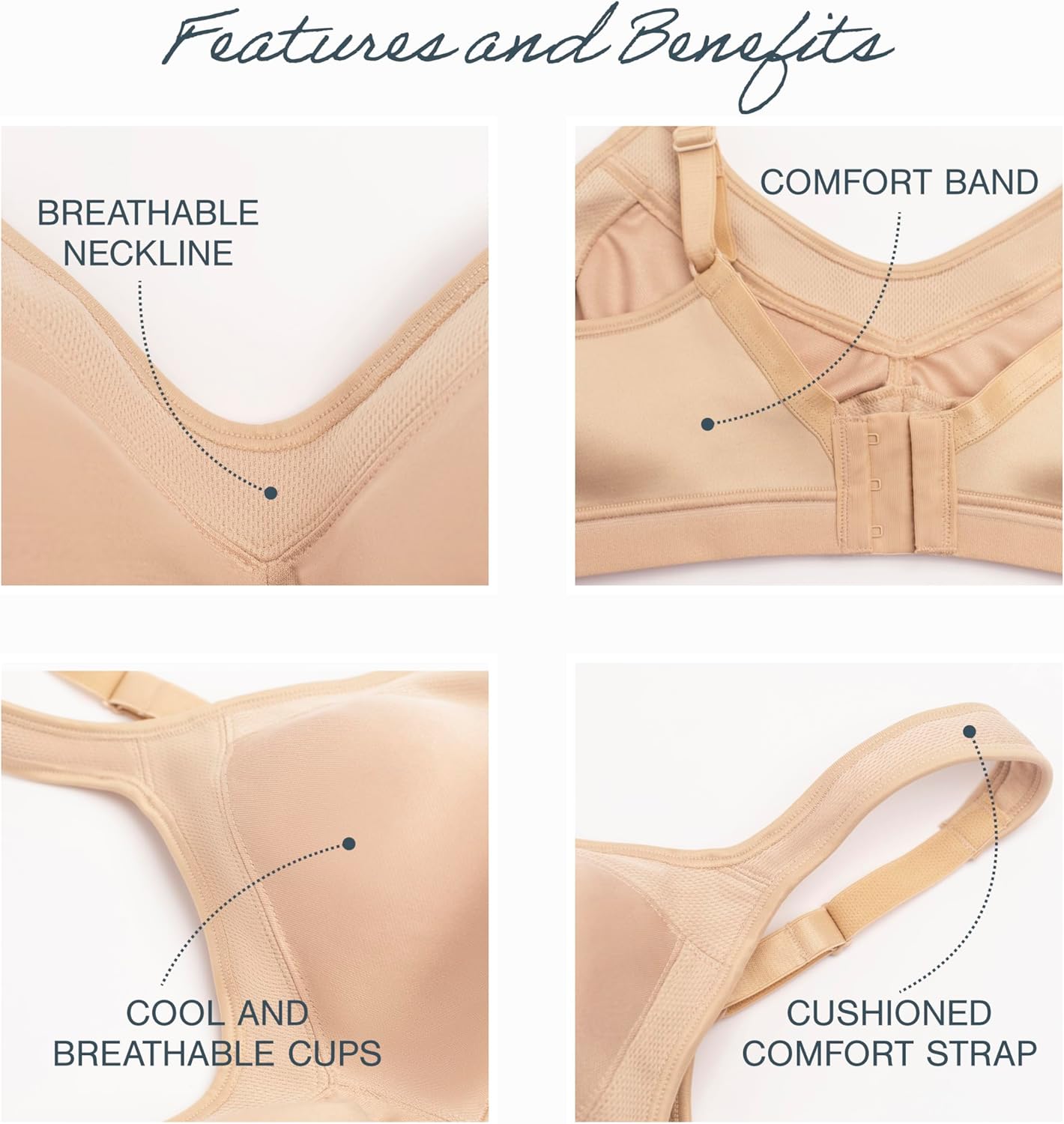 Here’s a bra from Playtex designed for light-to-moderate workouts and also for the rest of your day. Whether during a workout or during your workday, you’ll appreciate the Cool Comfort® cups, inner cooling band, and lightweight fabric that help keep you dry, cool, and comfortable. This smooth, seamless wirefree bra is fashioned around the famous Playtex® M-frame that comfortably conforms to your shape. This lightweight wireless bra is designed with the 4-way TruSUPPORT® system that provides higher sides for bulge control, fuller cups for natural shaping, wider straps for all-day ease, and a smoother back for enhanced stability. In addition, side slings contour to your curves for enhanced side support. Comfort is everywhere, from the stretch sides and back to the soft-touch under band to the extra-wide, cushioned, no-slip straps that help to relieve shoulder strain. Silky-smooth seamless cups virtually disappear under tees and clingy clothes. This comfy active bra is designed for light-to-moderate activities…and everything else!