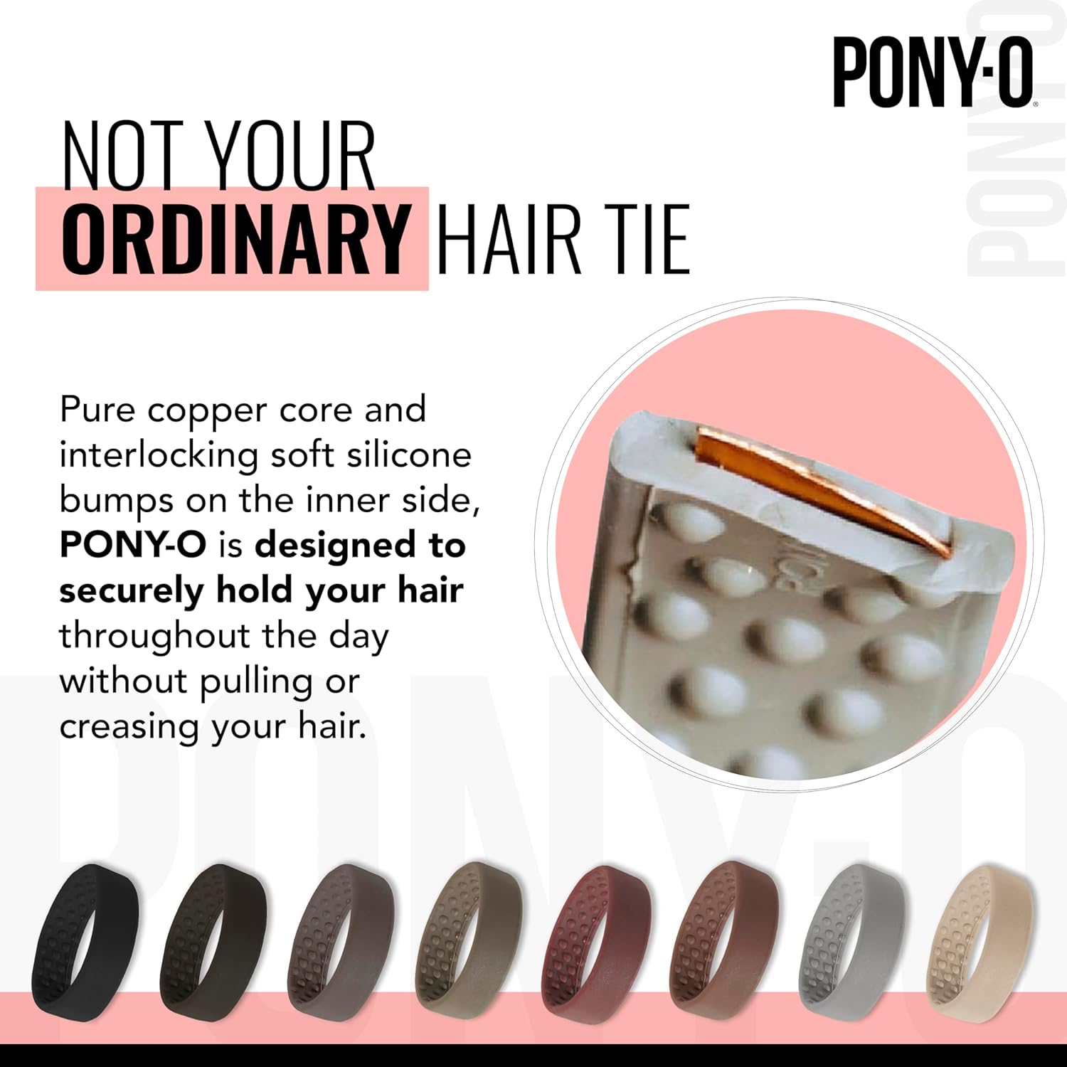 Made with a strong copper core and silicone grips, PONY-O keeps your hair in place without slipping, pulling or leaving creases