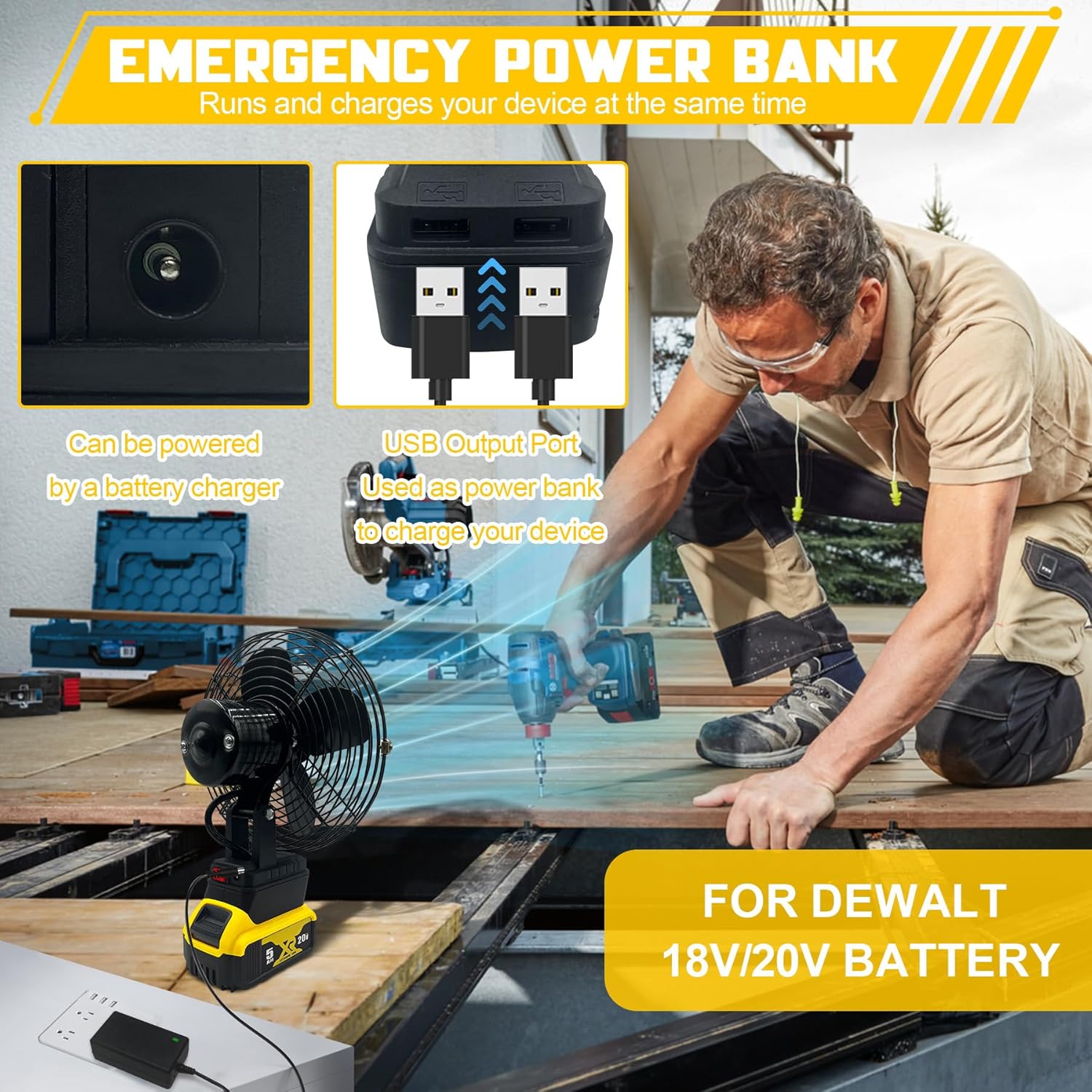 Portable Camping Fan for Dewalt 20V Batteries, Cordless Battery Operated Floor Fan, Metal Jobsite Fan with AC Adapter and USB Output for Picnic Camping Tent Fishing and Workshop (Battery Not Included)