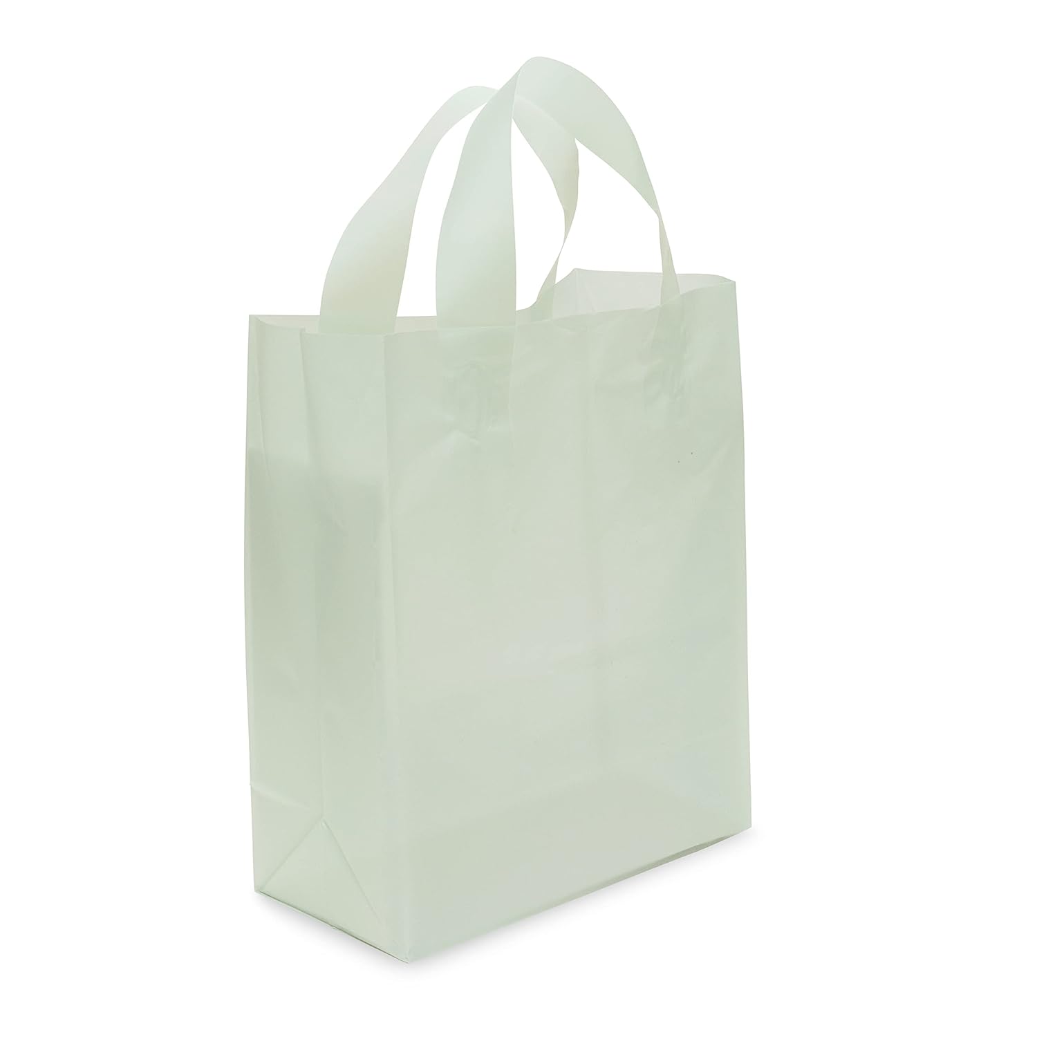 Prime Line Packaging’s premium quality, durable and waterproof soft strap mint gift bags are made with high quality frosted polyethylene plastic and cardboard-reinforced bottoms that will keep your merchandise, gifts, lunch, or any other items safe, secure, and dry. These semi-opaque frosted polyethylene plastic totes are perfect for adding a touch of privacy to any items stored inside. Coming in a variety of both sizes and colors, with thicknesses ranging from 1 MM to 2.5 MM, Prime Line Packaging’s line of frosted bags can meet a wide variety of your specific tastes and needs. Measuring 8” Wide x 4” Deep x 10” High, these small sized merchandising bags are perfect for holding smaller items securely. Our frosted mint plastic gift and take out bags are equipped with soft strap handles for a comfortable carry while retaining durability to prevent unwanted rips or tears during use. Each bag is made with both form and function in mind, and the stylish bags make the perfect goodie bags, party or wedding favor bags, event bags, gift bags, retail bags, or carry out bags. The bags can be further customized with stickers or adhesive applications to bear personalized monograms or your business or boutique logo. Coming in packs of 100, each bag folds flat when not in use for storage or shipping, ensuring that you can always have one of our premium quality frosted soft strap handle gift bags easily on hand for any of your gifting, retail, or takeout needs.