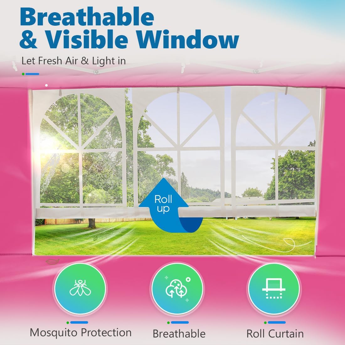 𝐑𝐎𝐋𝐋𝐀𝐁𝐋𝐄 𝐂𝐇𝐔𝐑𝐂𝐇 𝐖𝐈𝐍𝐃𝐎𝐖: This easy up canopy 10×10 with sidewalls features with rollable church window, which lets wind, light in and keeps rain out. Also the canopy window provides a better view of the scenery of nature. The easy up canopy tent with walls is a great plus for family gatherings, small parties or other outdoor events.