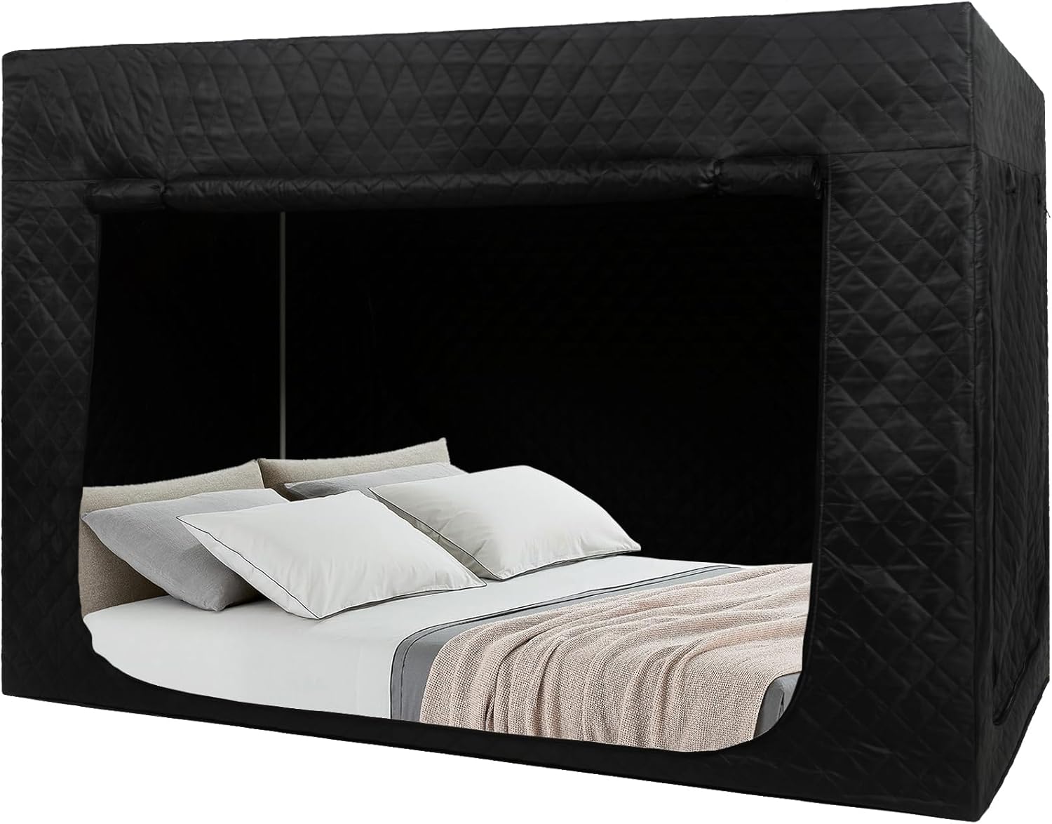 ☑Warm Sleeping Space: This bunk twin bed tent measures 75 x 39 x 39 inches, made of soft and warm quilted rayon lining. The dark black polyester fabric can reduce most of the light, quilted rayon lining prevent temperature loss and is great for winter bedrooms, dorm rooms, or those who have trouble sleeping in bright environments, creating a cozy and warm space to sleep in.