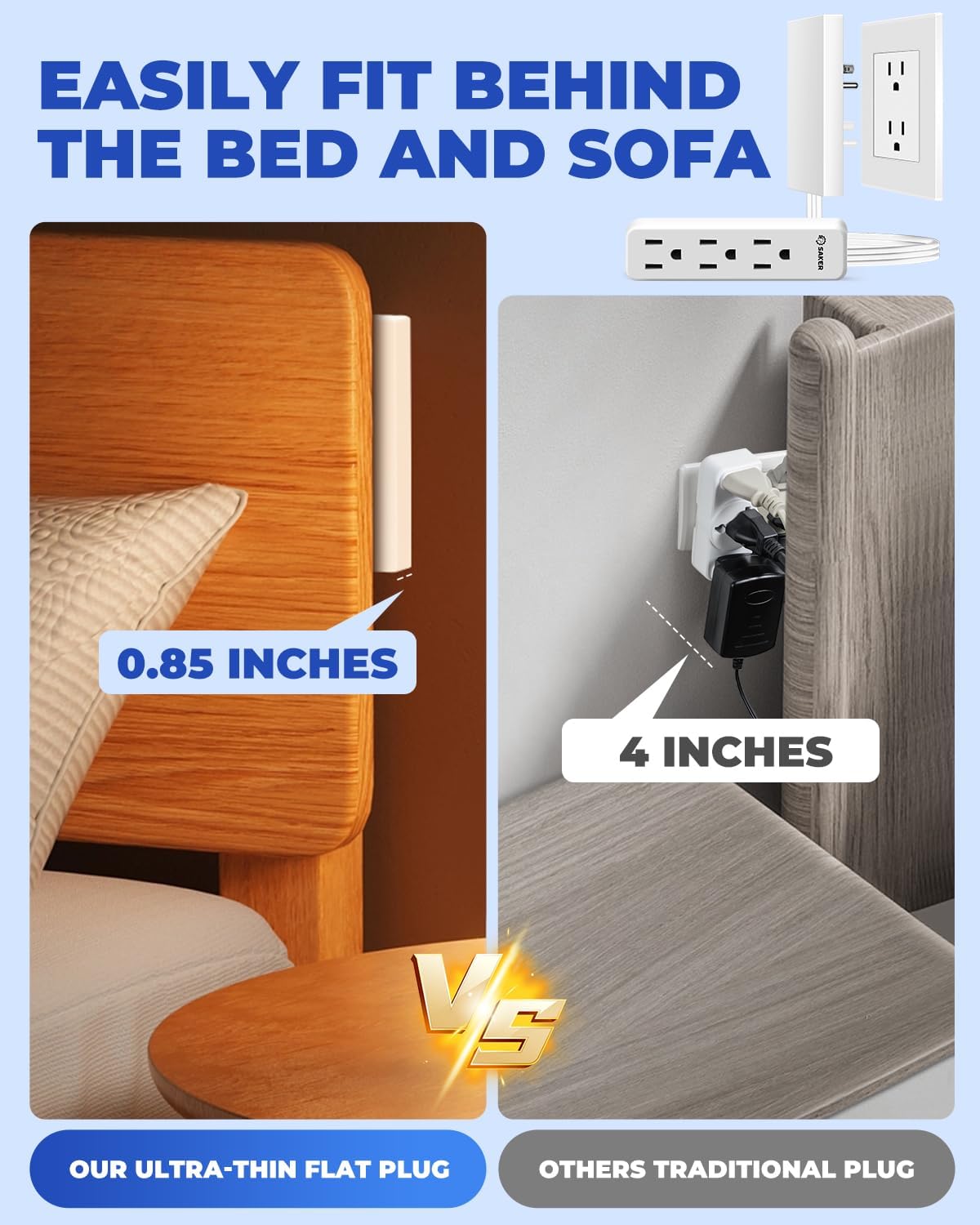 【ELEVATE YOUR SPACE】Upgrade your space with our flat plug power strip. Effortlessly hide extension cord for a sleek, organized look in any room. Keep your home safe and stylish with our flat wall plug extension cord.