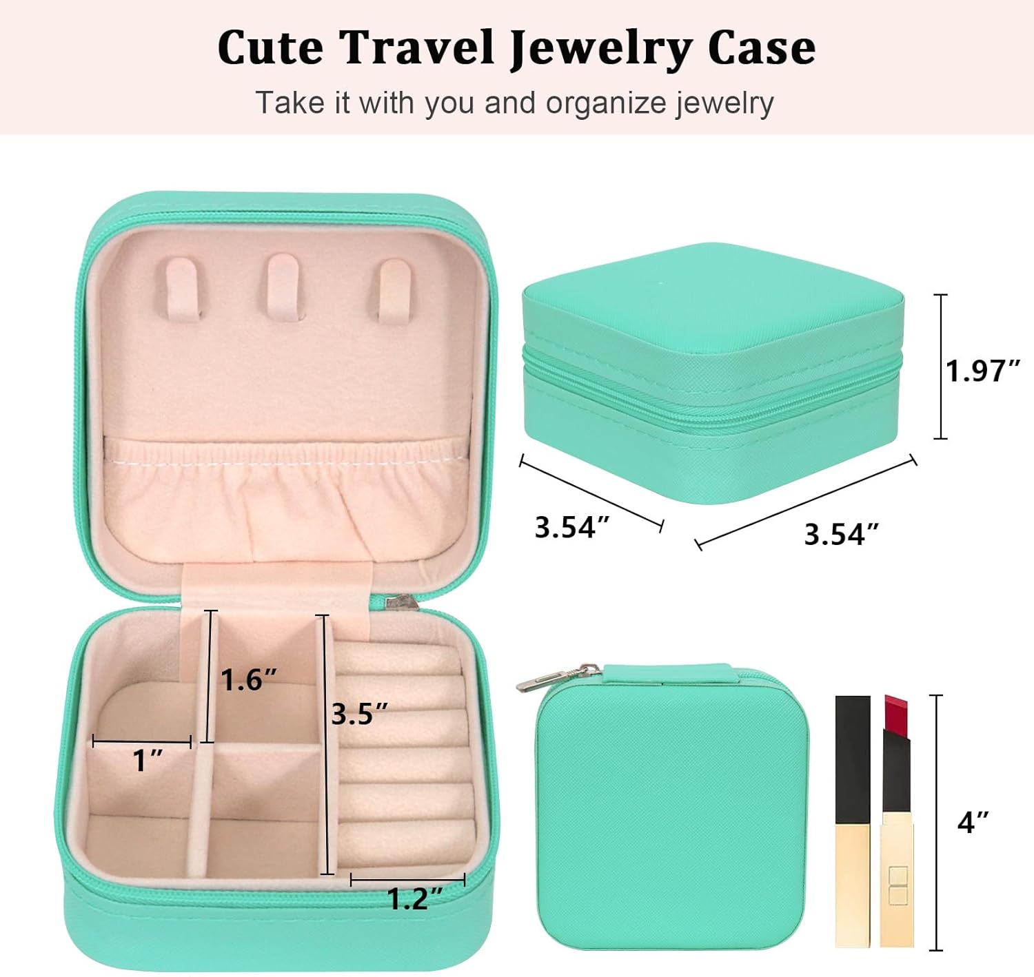 Small travel jewelry box for girls storage earring studs, hoop rings, short necklaces, pendant, lipstick, brooch, hair pin and other travel accessories organized on a short trip or daily use on the bedside table