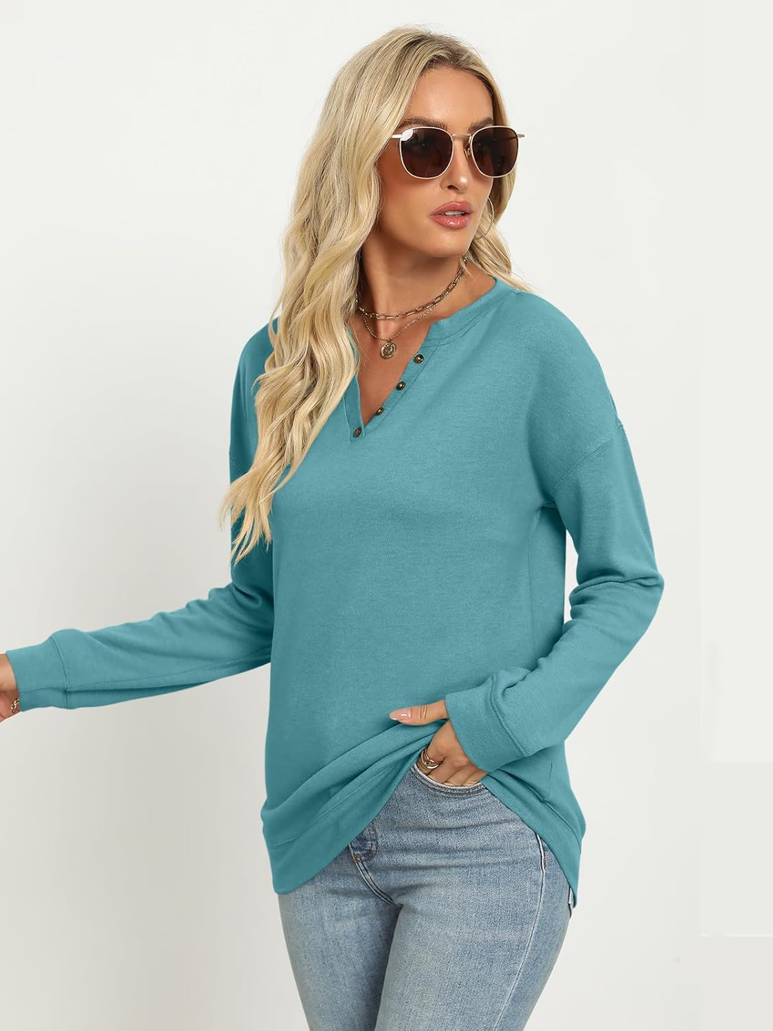 Women’s V Neck Long Sleeve Henley Shirts Casual Button Tunic Tops
