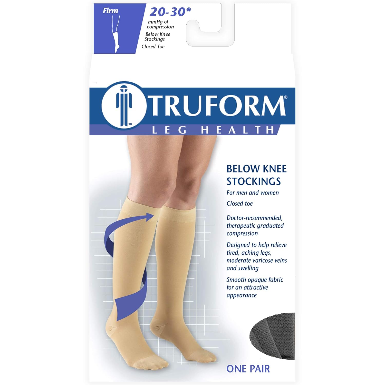 Truform 8865 was created to help treat conditions associated with poor circulation. Graduated compression technology delivers a compressive action to the leg that is greatest at the ankle, then gradually decreases toward the heart. The 20-30 mmHg Firm compression level is great for post surgery and severe edema, varicose veins, ypotension, post thrombotic syndrome (PTS), post sclerotherapy, and more. Truform therapeutic medical stockings feature classic styling and a smooth knit fabric that helps conceal unsightly conditions. The closed toe offers a more natural stocking feel. Color options are basic neutrals for all-occasion wear. Truform stockings, socks and pantyhose feature Graduated Compression Technology, which delivers a compressive action to the leg that is greatest at the ankle, then gradually decreases toward the heart. Graduated compression provides two primary benefits: it helps treat and lessen swelling for the wearer, and the compression action help to treat the slowing of blood flow so it can flow more quickly up the leg back toward the heart. Truform graduated compression support hosiery helps maintain positive circulation and leg health. We take the extra time and effort necessary to insure a therapeutically effective, comfortable fit. The combination of state-of-the-art materials and equipment, plus knitting know-how sets Truform apart from the crowd to make your legs look and feel great. Choose short length size when length from heel at floor to back bend of kne measures less than 15 inches.