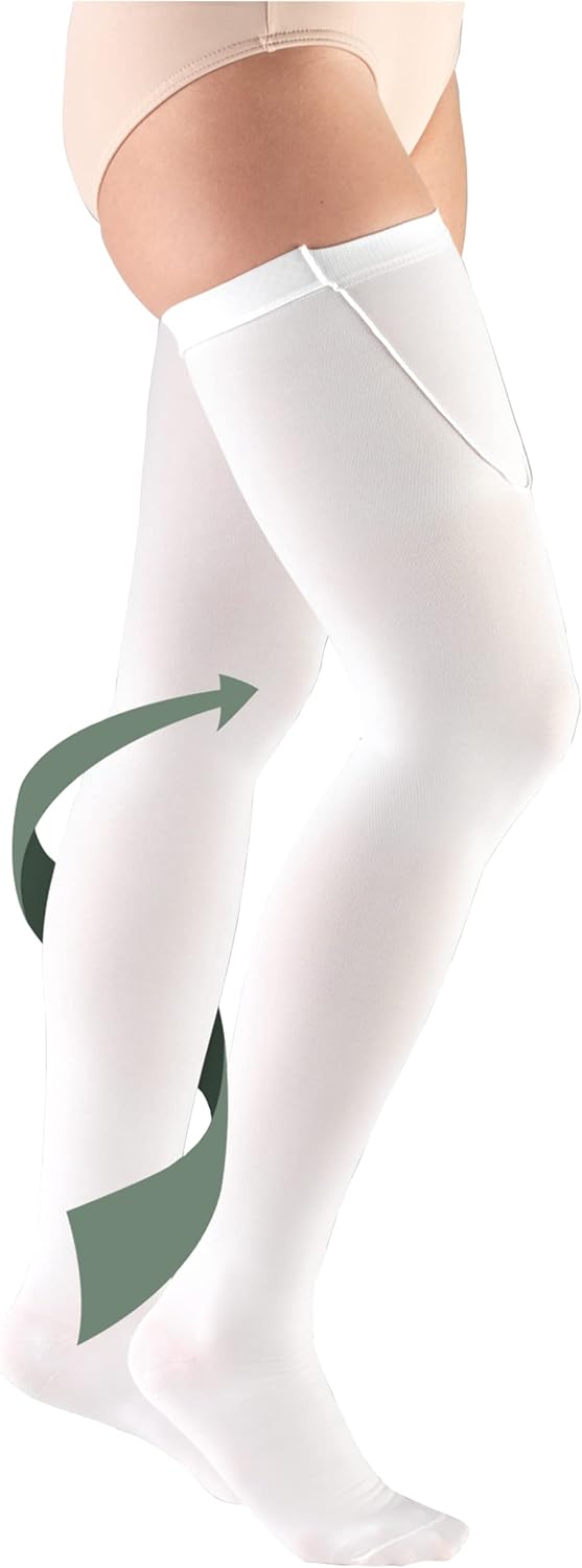 Expandable thigh panel; Silicone grip top band; Defined heel; Roomy comfort toe for sensitive feet