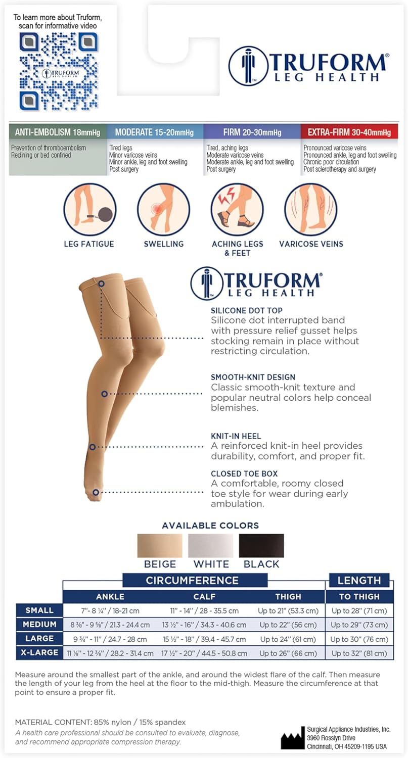 Truform 8810 from the “Classic Medical” Series for both men and women uses graduated compression technology to restore leg health. A higher 18 mmHg compression rating is targeted at the ankle, and helps circulation during post hospital recovery. Anti-embolism, commonly referred to as TED (thrombi-embolism-deterrent) hose are a preferred choice for recuperating patients. These compression stockings are doctor recommended for post-surgical treatment. The smooth knit and traditional styling are made to perform with daily use. Opaque material conceals various conditions using a functional design for increased durability. Sizes range from standard to plus size XXXL. Package includes 1 pair. Use for: prevention of thromboembolism; reclining or bed confined home Convalescence