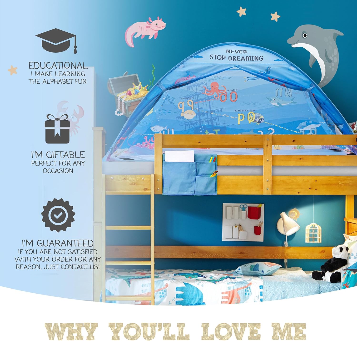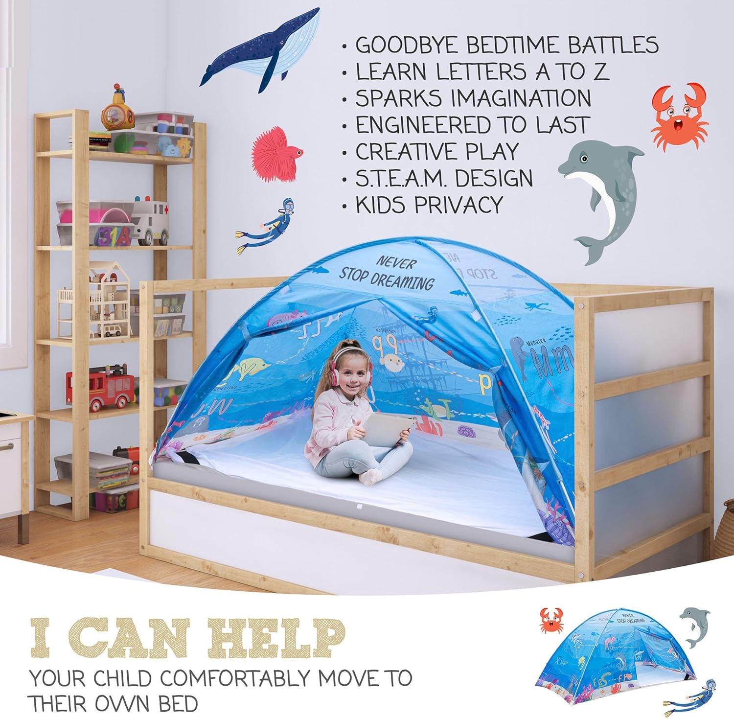Under The Sea Bed Tent for Kids – Magical Dream Tents with Educational Bedroom Decor – Top Bunk Beds Canopy Privacy Pop Up Sleep Pod for Girls and Boys Indoor Fort – Twin and Full Size Mattress