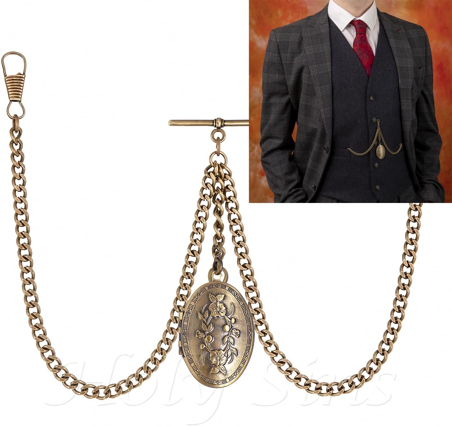 Vintage-Inspired 14″ Bronze Pocket Watch Chain with Photo Locket Pendant | Elegant Double Albert T-Bar Design | Men’s Classic Accessory