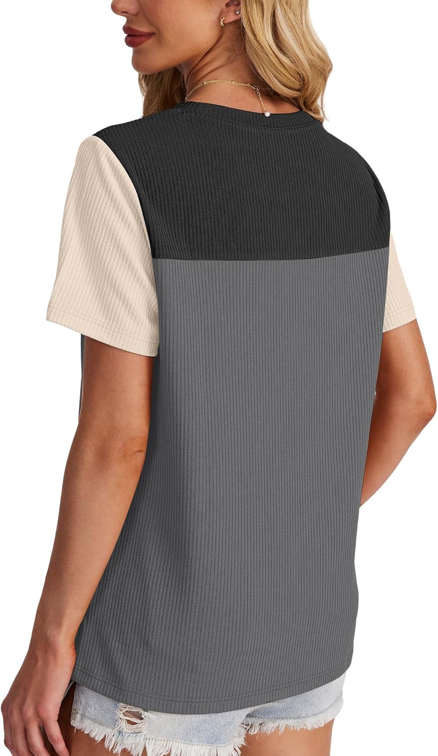 WIHOLL Womens Fashion 2025 Color Block Shirts Short Sleeve Crewneck Knitted Spring Summer Tops Casual Trendy