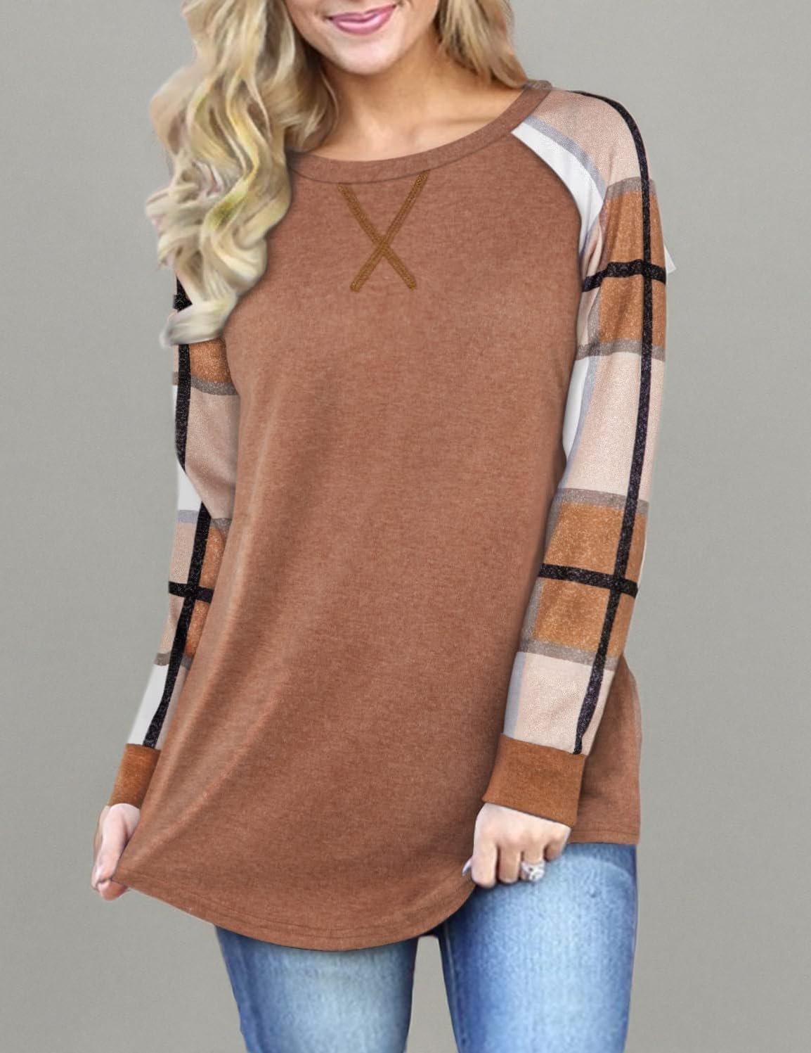 Womens Long Sleeve Buffalo Plaid Shirt Loose Fitting Patchwork Raglan Check Tops