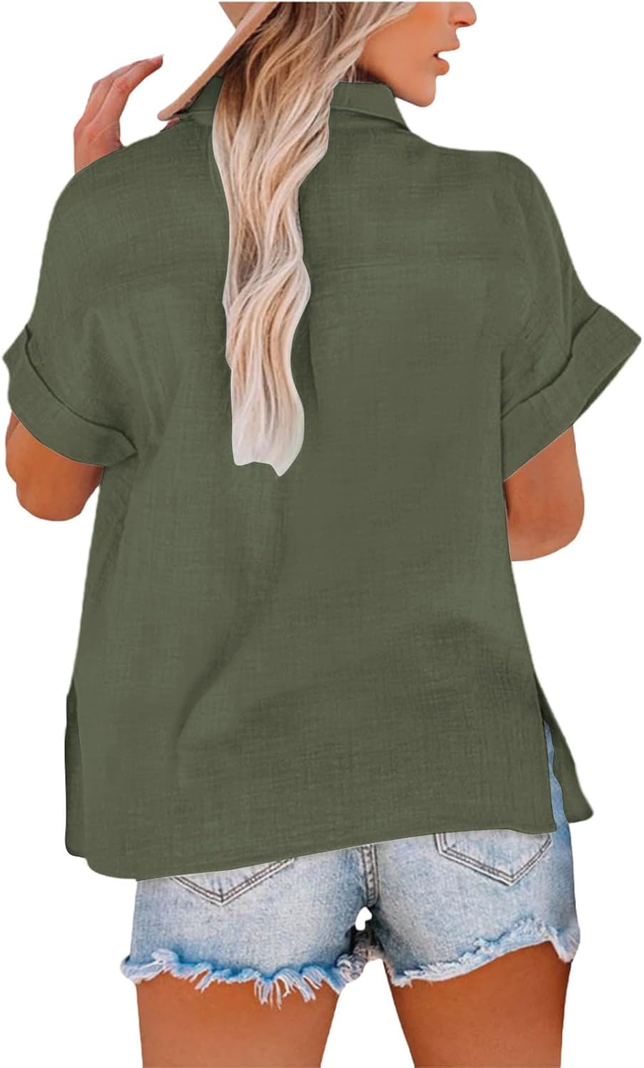 Women’s Solid V-Neck Linen Shirt – 2025 Lightweight Summer Beach Top, Short Sleeve Boho Button Front Casual Blouse
